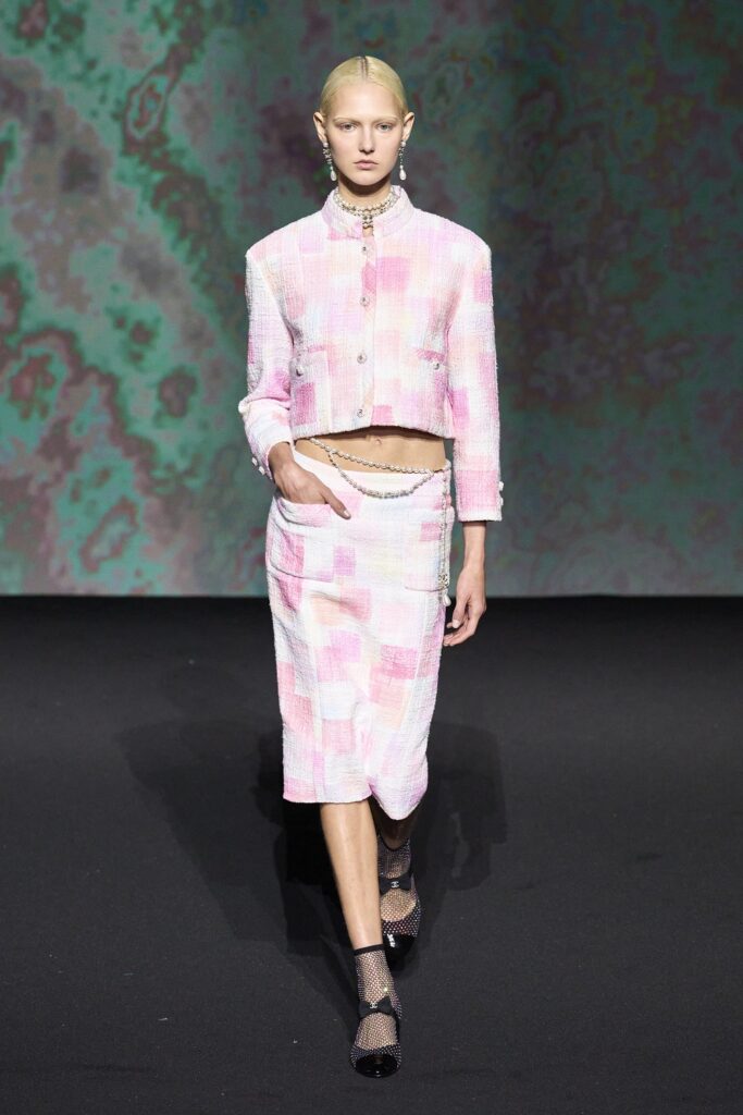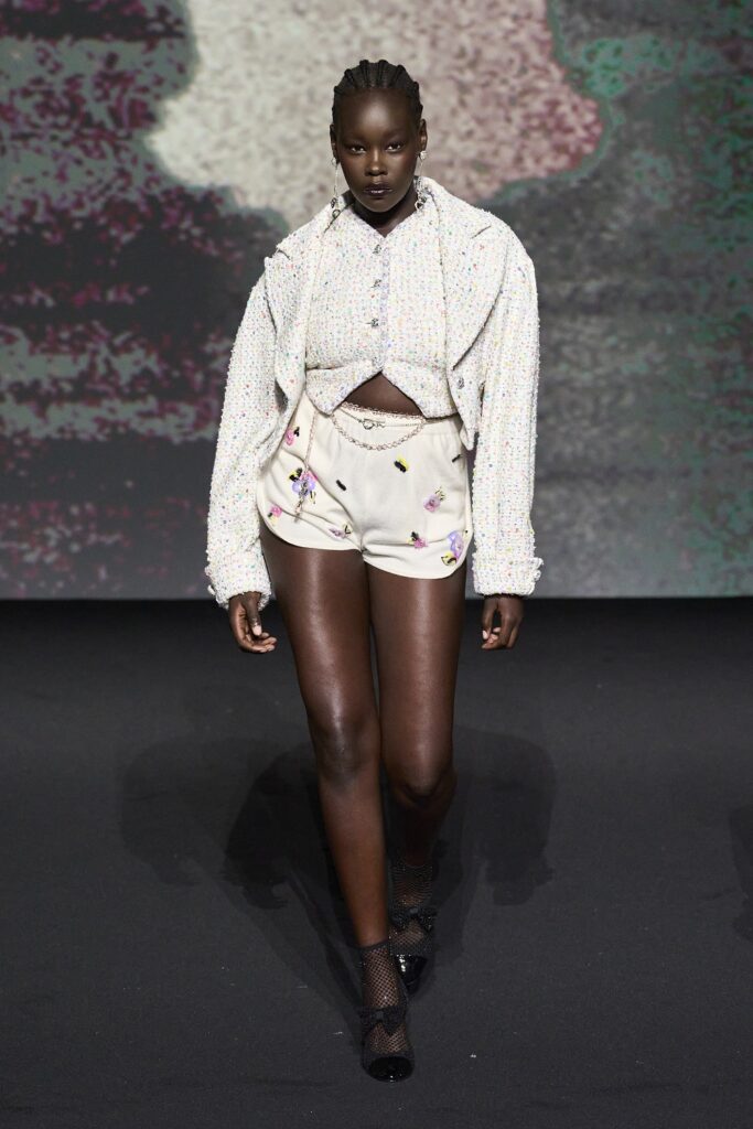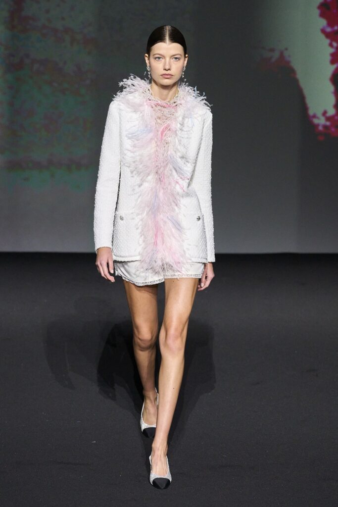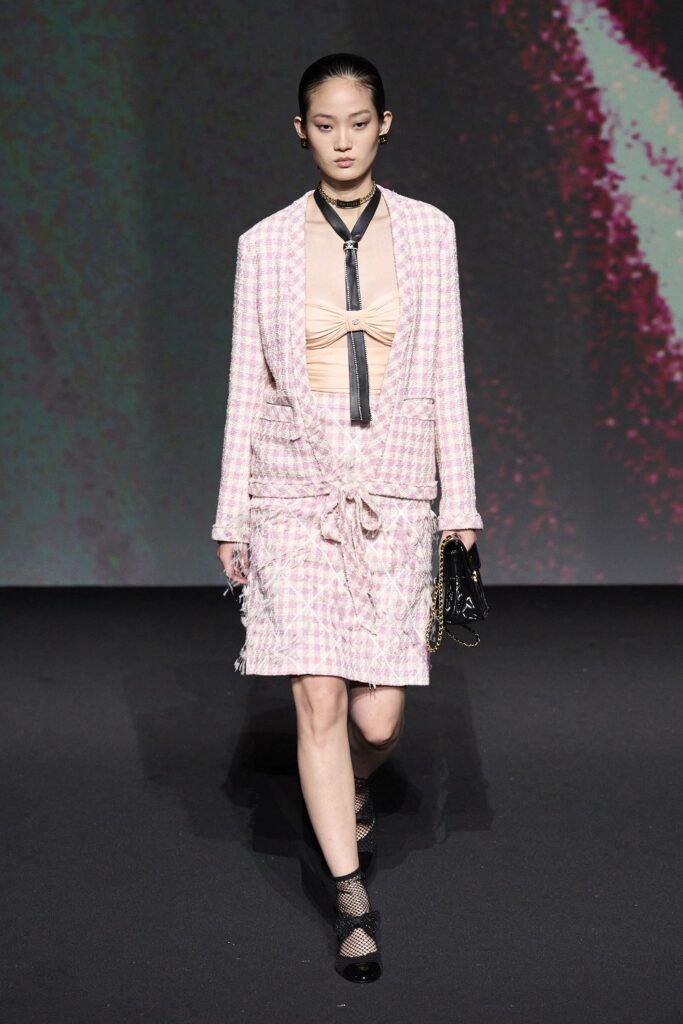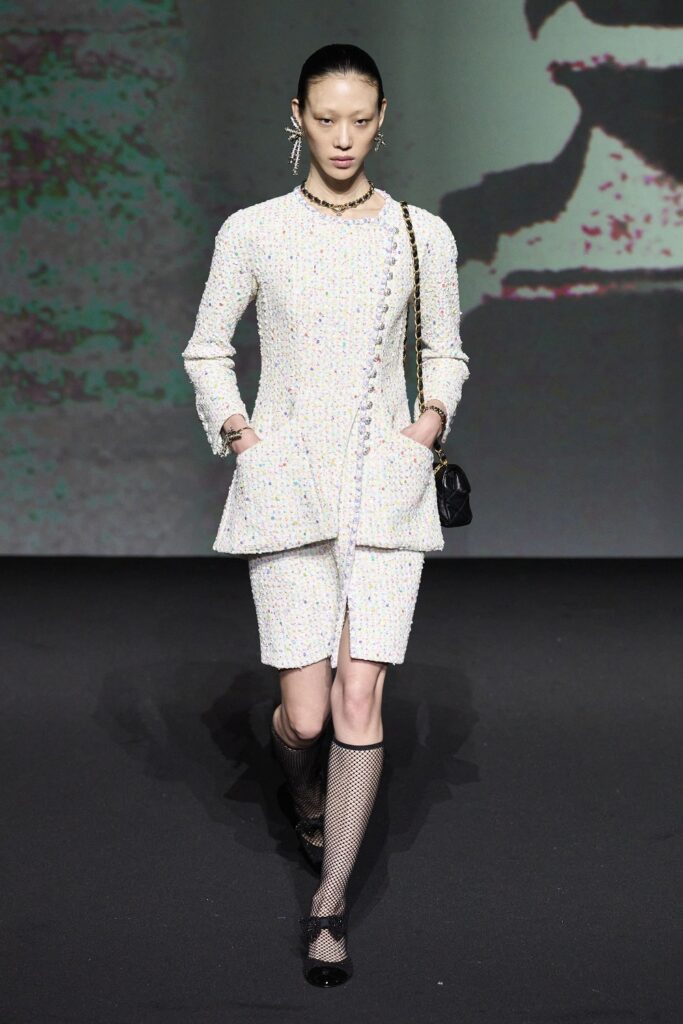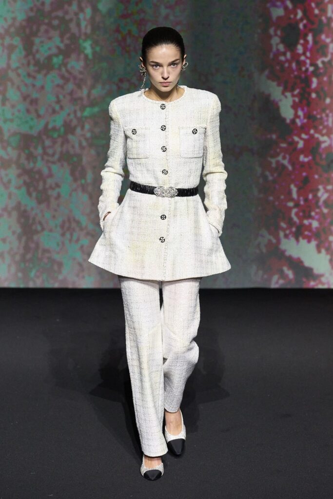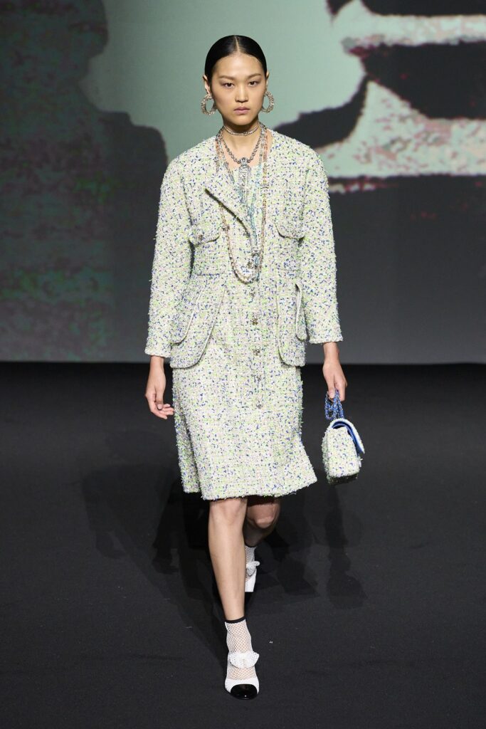 Αν κάτι ξεχωρίζει αυτή την άνοιξη του 2023, είναι η εκδοχή της Viard στην τάση logomania. Η πρότασή της το προσεγγίζει από μια πολύ, πολύ διακριτική οπτική: κοστούμια με χρυσές λάμψεις που ενσωματώνουν κύκλους με το διπλό C, μαύρα φορέματα στα οποία το logo φαίνεται μόνο στο φως ή μίνι φορέματα δεκαετίας του ’60 με φιόγκους ή τα γράμματα του οίκου στο ύφασμα. Ακολουθώντας τους κώδικες της Chanel, η καμέλια είναι ένα άλλο από τα μοτίβα που υπάρχουν στη συλλογή: ένα ασπρόμαυρο σακάκι με λουλούδια και σατέν πέτο ή ένα λουλούδι σε φορέματα από διαφορετικά υφάσματα.