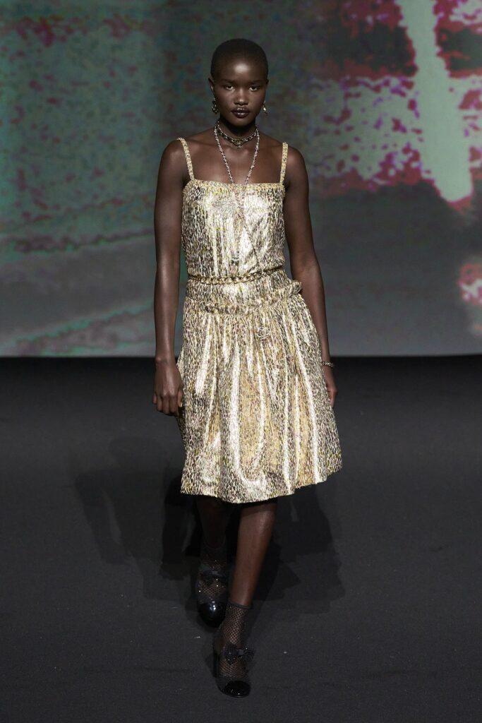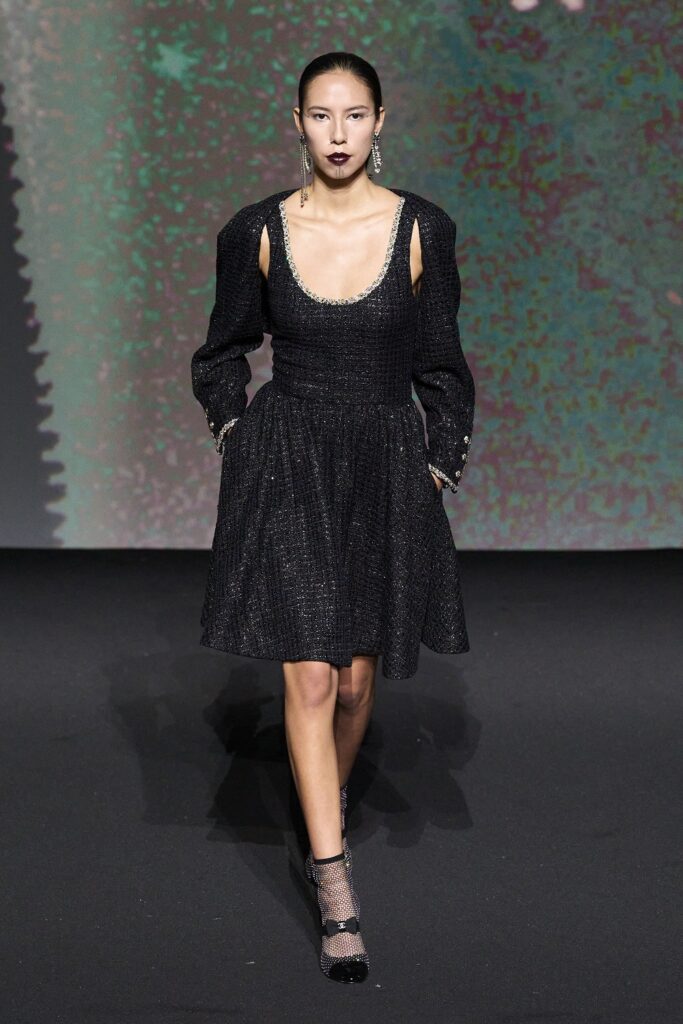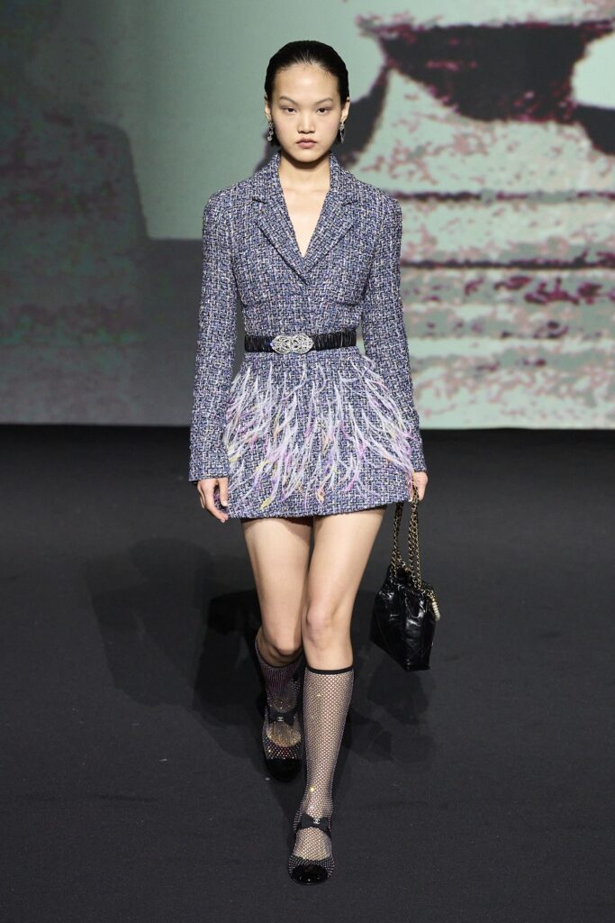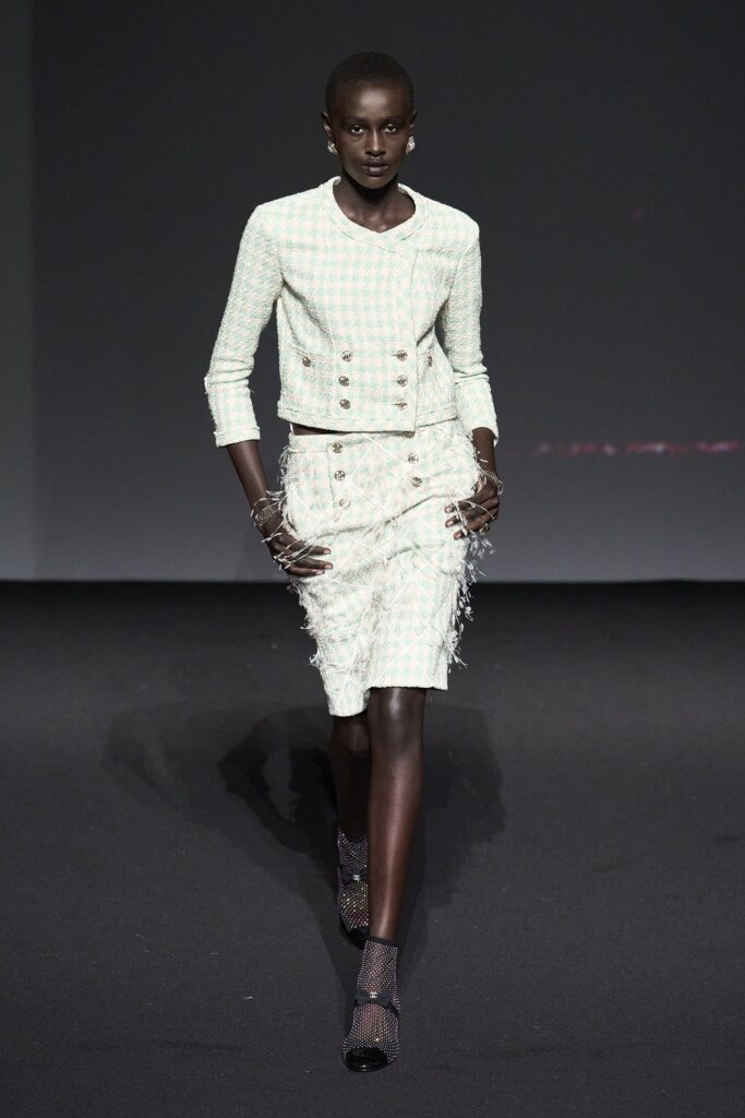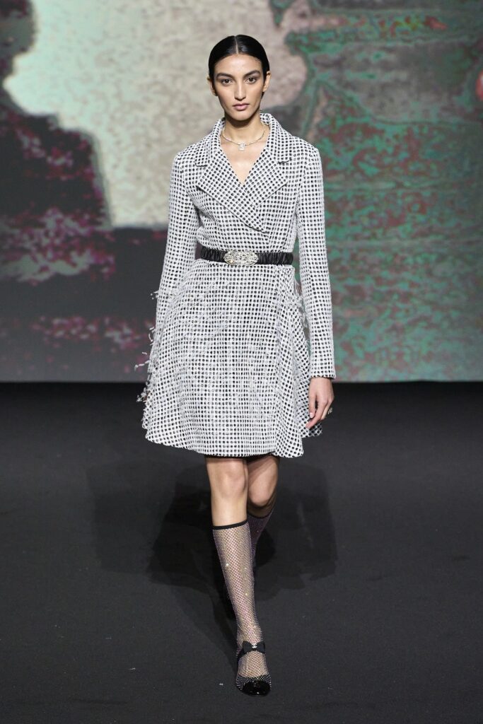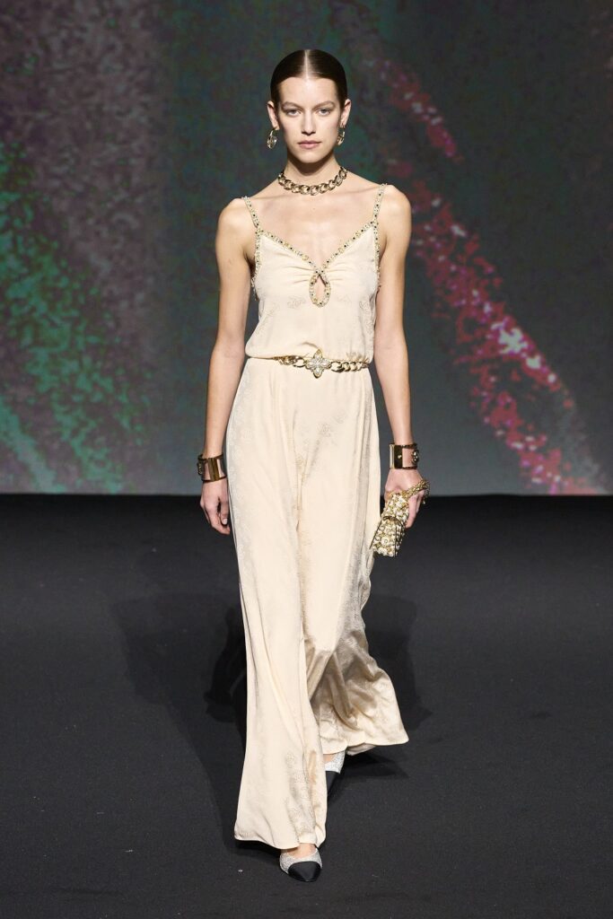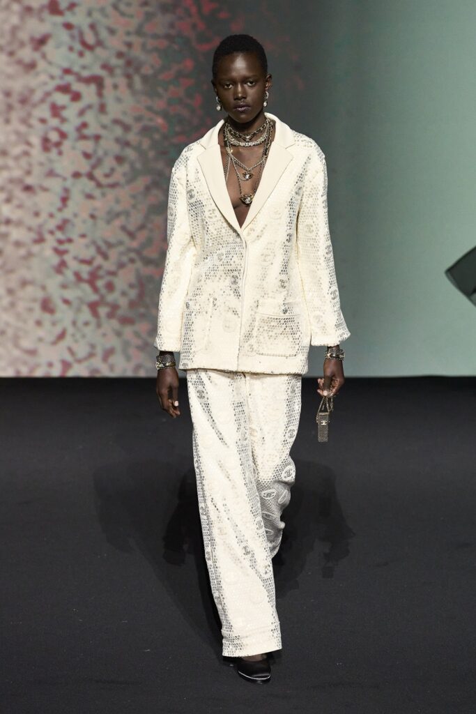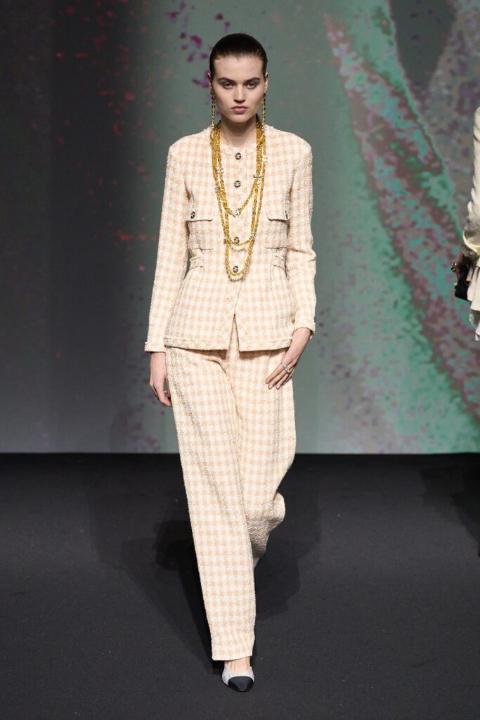Αν κάτι ξεχωρίζει αυτή την άνοιξη του 2023, είναι η εκδοχή της Viard στην τάση logomania. Η πρότασή της το προσεγγίζει από μια πολύ, πολύ διακριτική οπτική: κοστούμια με χρυσές λάμψεις που ενσωματώνουν κύκλους με το διπλό C, μαύρα φορέματα στα οποία το logo φαίνεται μόνο στο φως ή μίνι φορέματα δεκαετίας του ’60 με φιόγκους ή τα γράμματα του οίκου στο ύφασμα. Ακολουθώντας τους κώδικες της Chanel, η καμέλια είναι ένα άλλο από τα μοτίβα που υπάρχουν στη συλλογή: ένα ασπρόμαυρο σακάκι με λουλούδια και σατέν πέτο ή ένα λουλούδι σε φορέματα από διαφορετικά υφάσματα.