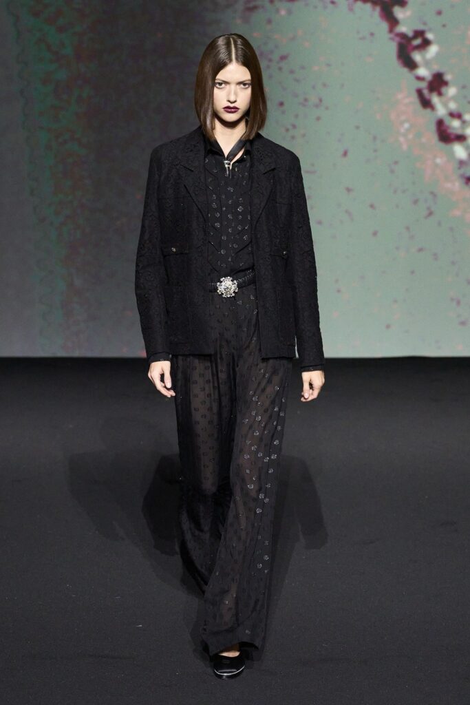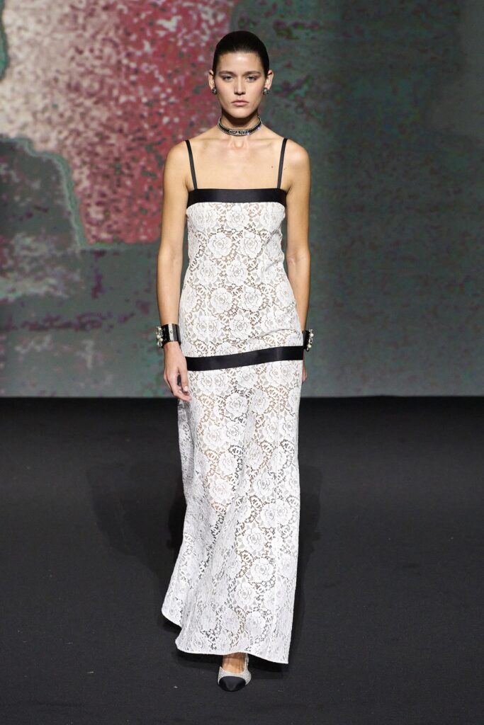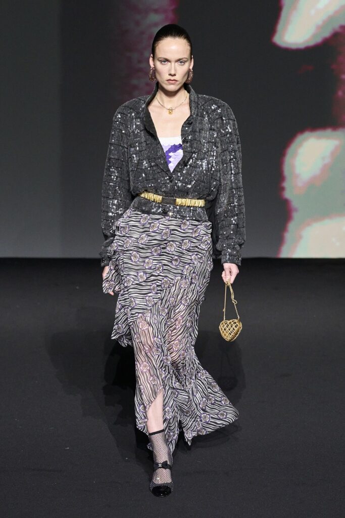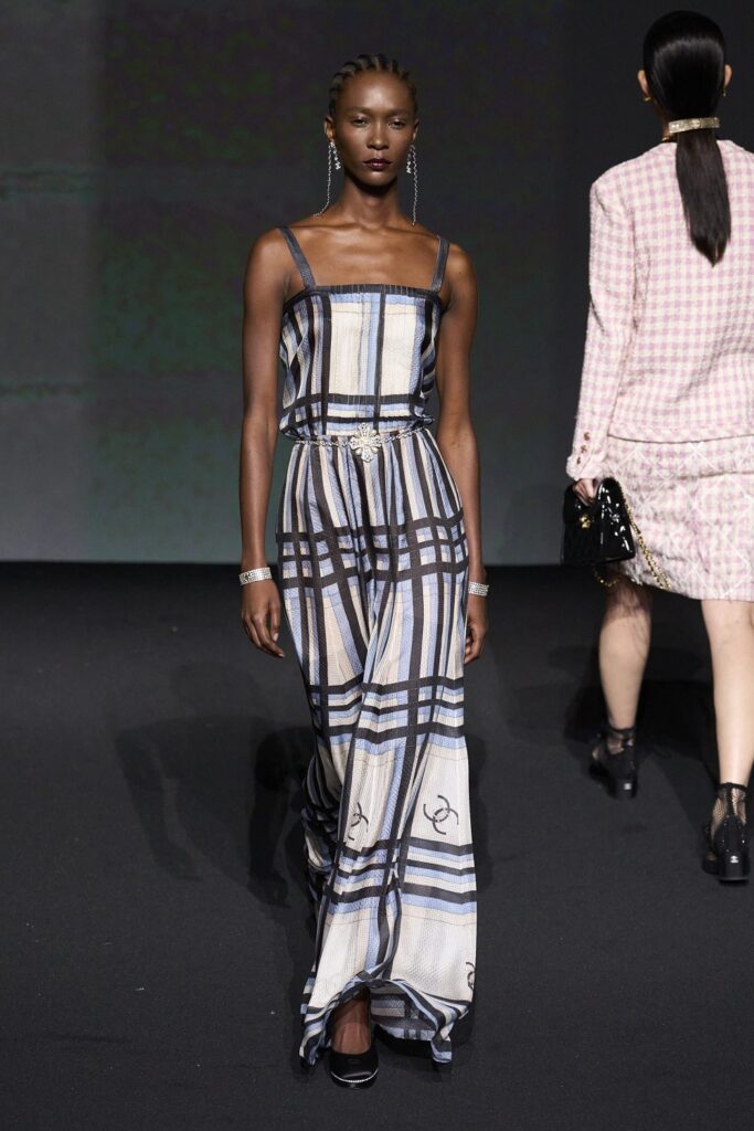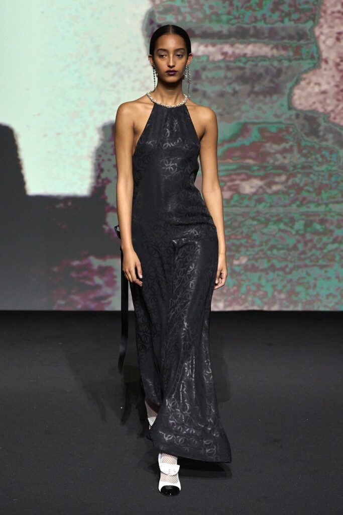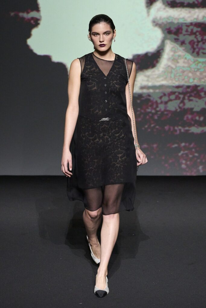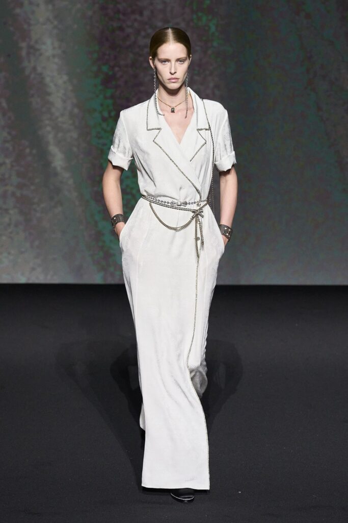Αν κάτι ξεχωρίζει αυτή την άνοιξη του 2023, είναι η εκδοχή της Viard στην τάση logomania. Η πρότασή της το προσεγγίζει από μια πολύ, πολύ διακριτική οπτική: κοστούμια με χρυσές λάμψεις που ενσωματώνουν κύκλους με το διπλό C, μαύρα φορέματα στα οποία το logo φαίνεται μόνο στο φως ή μίνι φορέματα δεκαετίας του ’60 με φιόγκους ή τα γράμματα του οίκου στο ύφασμα. Ακολουθώντας τους κώδικες της Chanel, η καμέλια είναι ένα άλλο από τα μοτίβα που υπάρχουν στη συλλογή: ένα ασπρόμαυρο σακάκι με λουλούδια και σατέν πέτο ή ένα λουλούδι σε φορέματα από διαφορετικά υφάσματα.