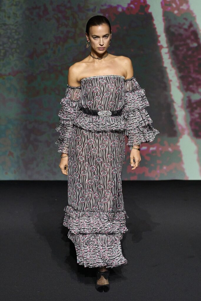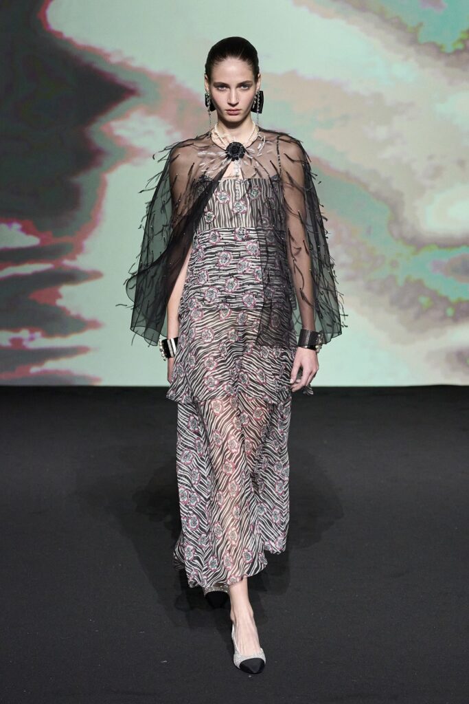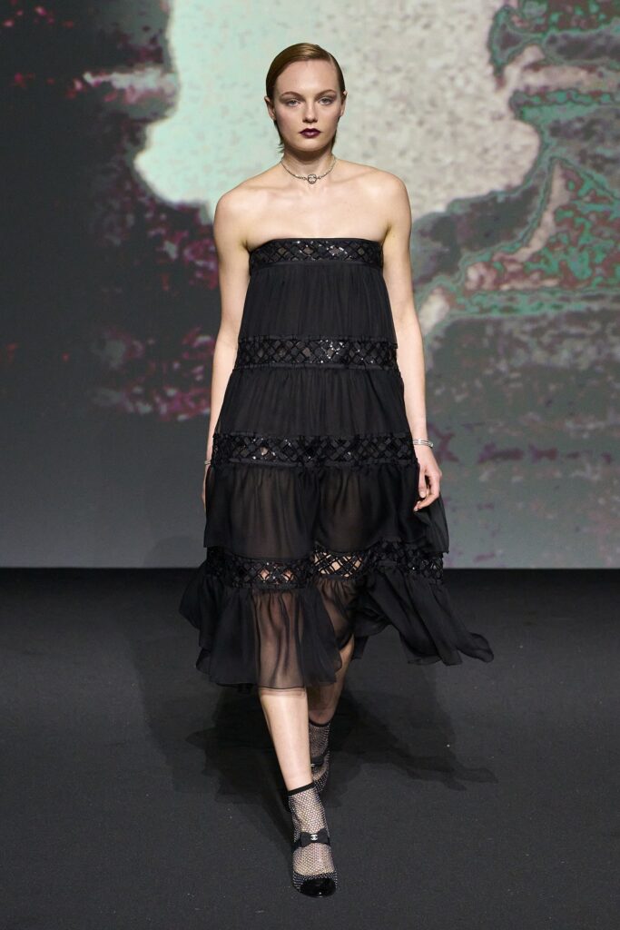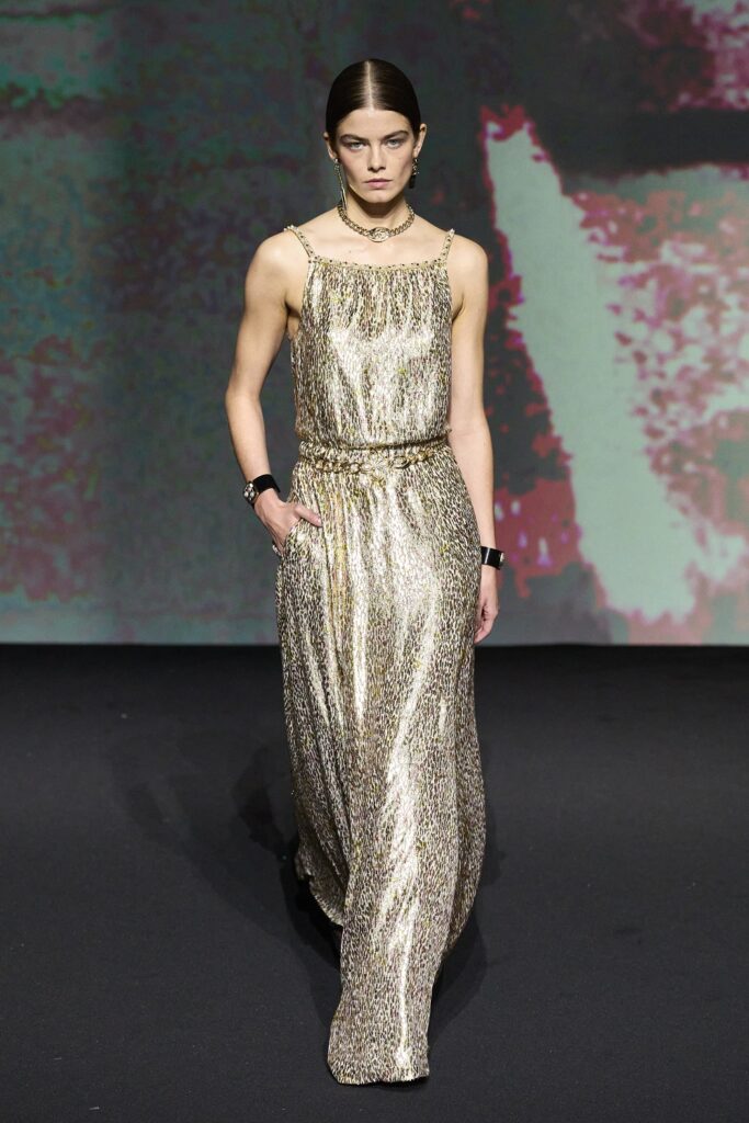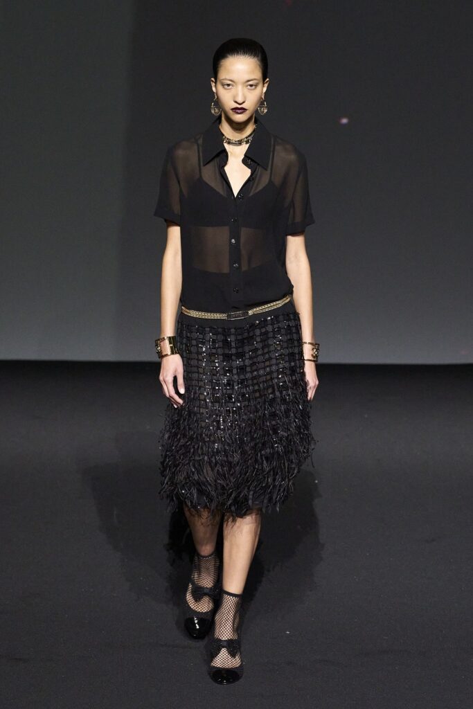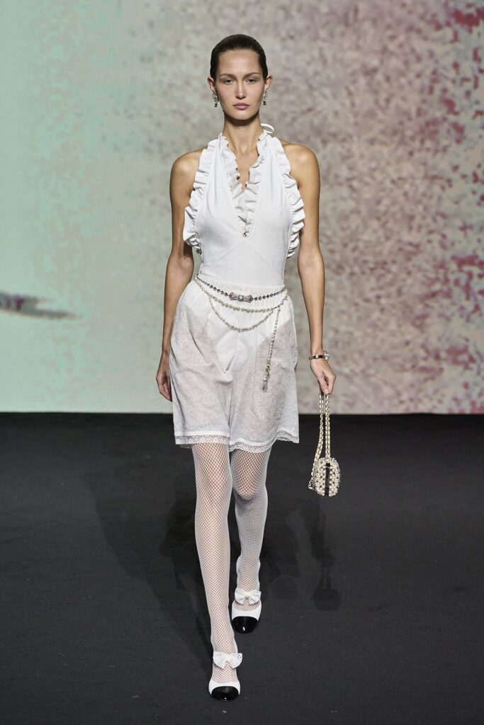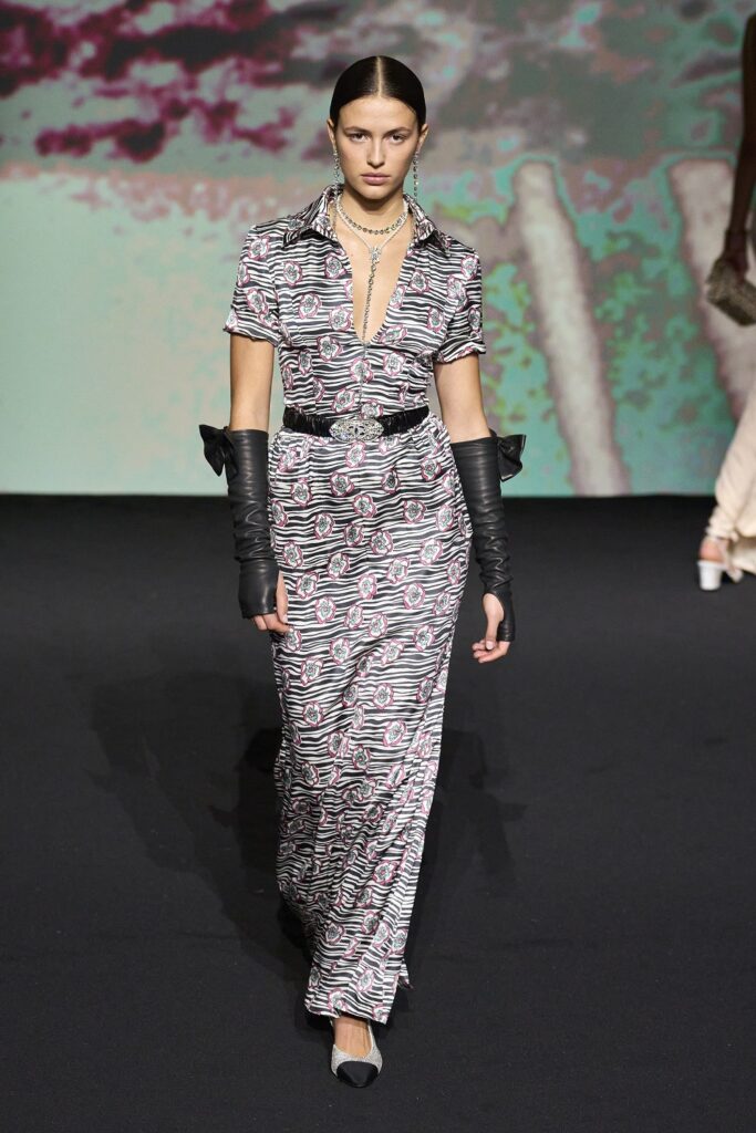 Αν κάτι ξεχωρίζει αυτή την άνοιξη του 2023, είναι η εκδοχή της Viard στην τάση logomania. Η πρότασή της το προσεγγίζει από μια πολύ, πολύ διακριτική οπτική: κοστούμια με χρυσές λάμψεις που ενσωματώνουν κύκλους με το διπλό C, μαύρα φορέματα στα οποία το logo φαίνεται μόνο στο φως ή μίνι φορέματα δεκαετίας του ’60 με φιόγκους ή τα γράμματα του οίκου στο ύφασμα. Ακολουθώντας τους κώδικες της Chanel, η καμέλια είναι ένα άλλο από τα μοτίβα που υπάρχουν στη συλλογή: ένα ασπρόμαυρο σακάκι με λουλούδια και σατέν πέτο ή ένα λουλούδι σε φορέματα από διαφορετικά υφάσματα.