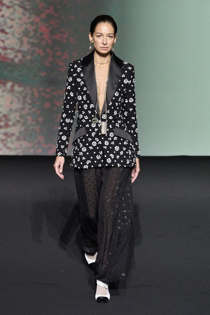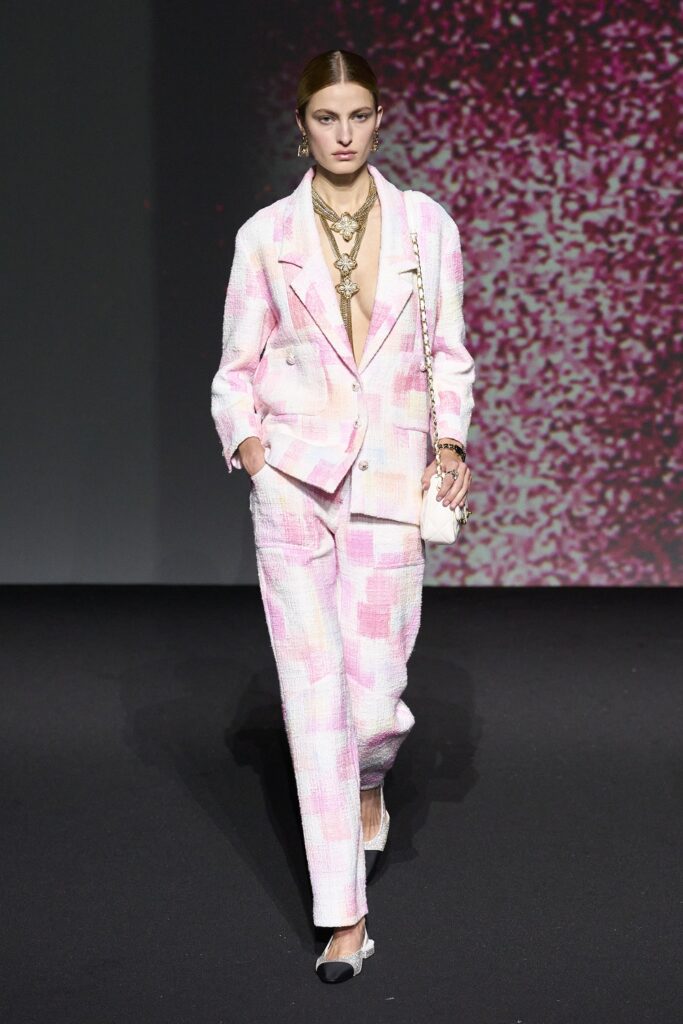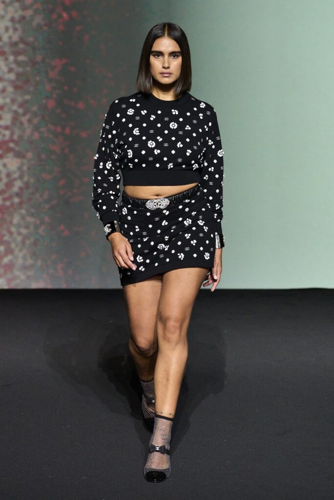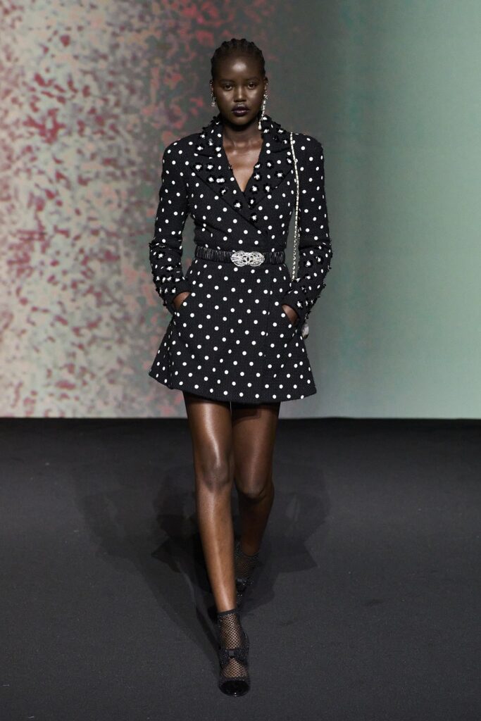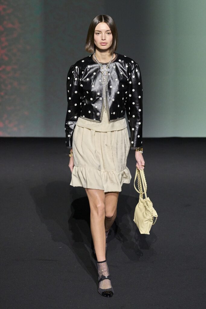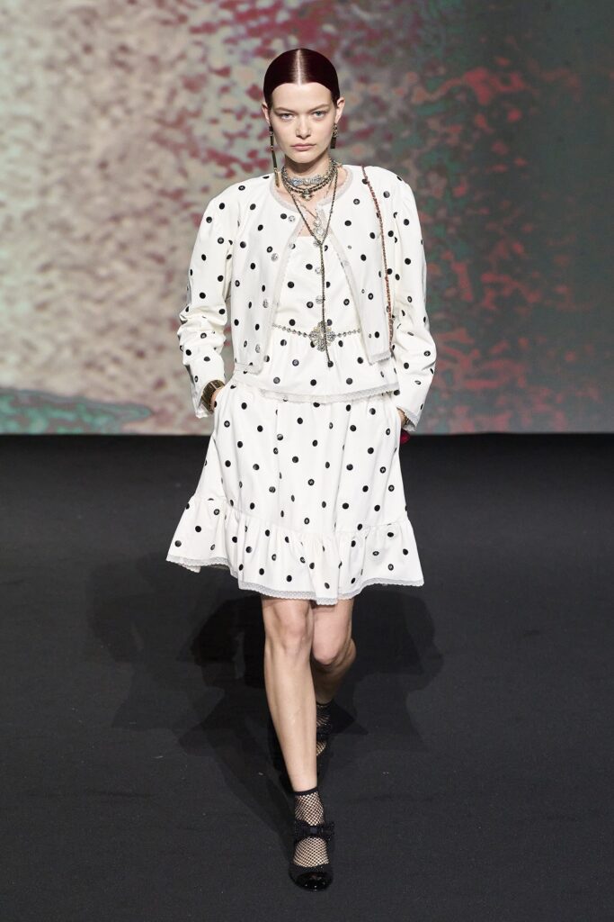 Ένα άλλο από τα μοτίβα που υπάρχουν στη συλλογή είναι το πουά τυπωμένο σε ασπρόμαυρα total λουκ, τόσο σε ασορτί σύνολα όσο και σε μεμονωμένα κομμάτια. Το μαύρο δέρμα δεν λείπει από τη νέα συλλογή κι έρχεται με λευκά πουά, τόσο σε ολόσωμες φόρμες όσο και σε δερμάτινα τζάκετ. Το τουίντ ξεπερνά το κλασικό σετ του σακακιού και του παντελονιού ή της φούστας. Αυτή την άνοιξη, η Chanel ποντάρει σε ασορτί μαύρα σύνολα φορεμάτων και παλτών. Ίσως το πιο αναζωογονητικό στοίχημα είναι ένα είδος σετ παντελονιού και γιλέκου με χαλαρά μοτίβα που συνδυάζονται με με πλεκτά, είτε είναι φούτερ είτε τοπ με πεσμένους ώμους.