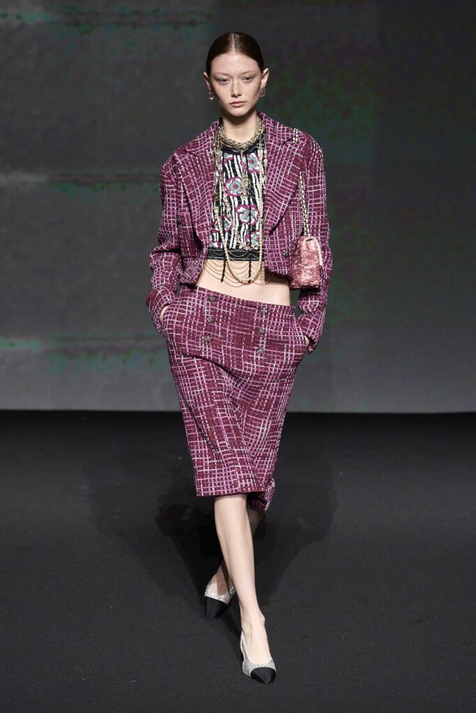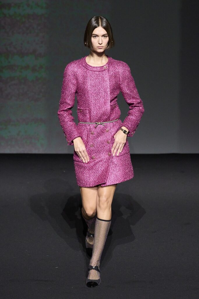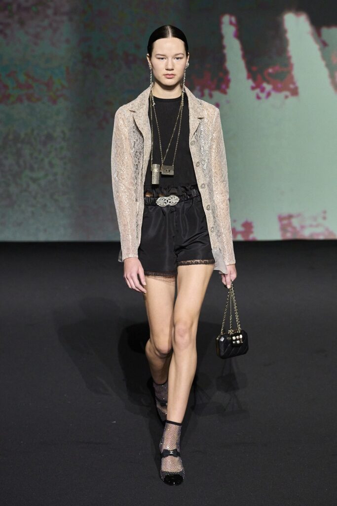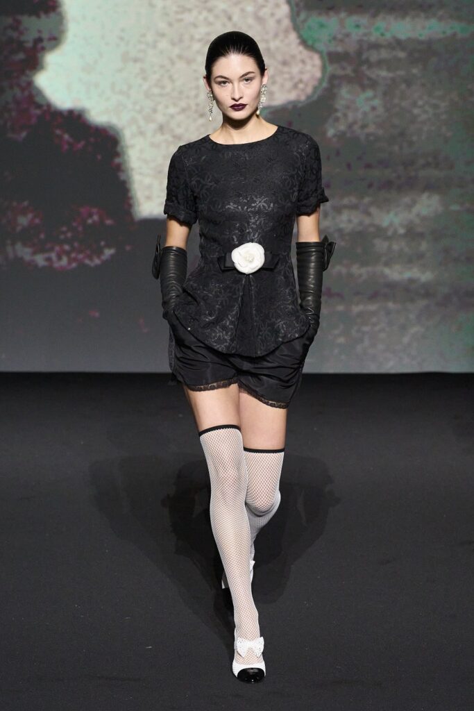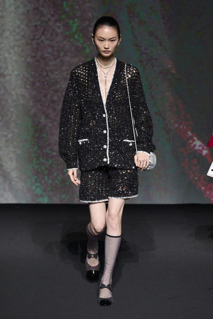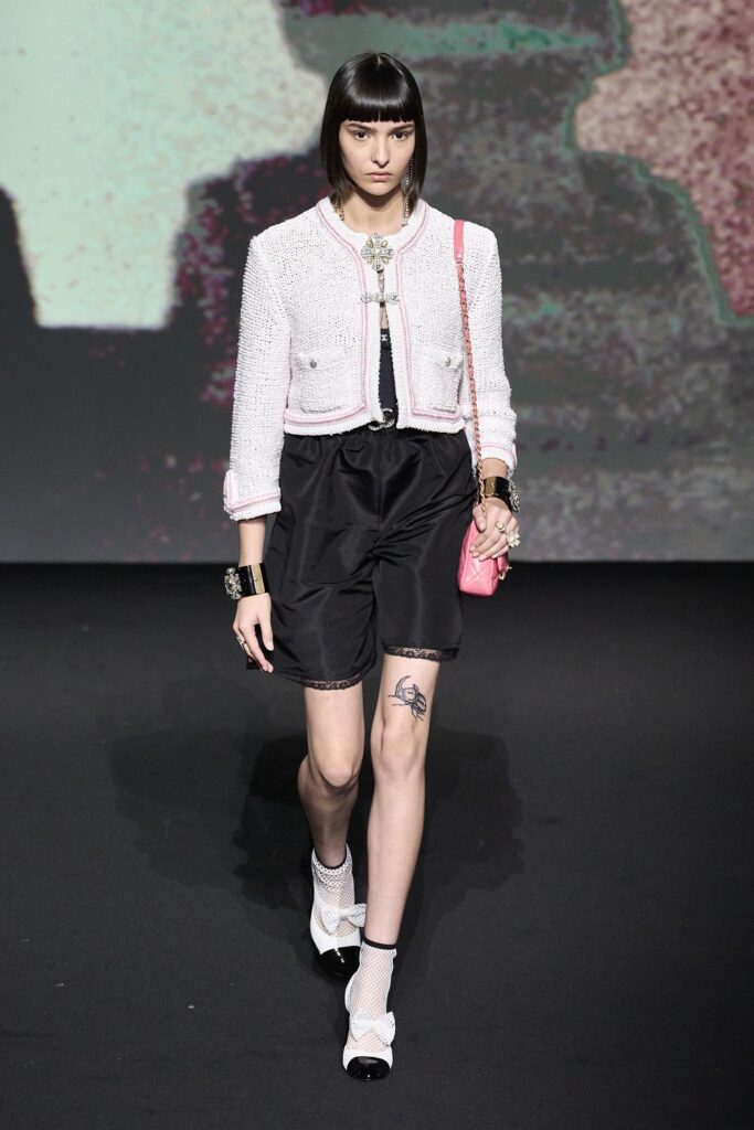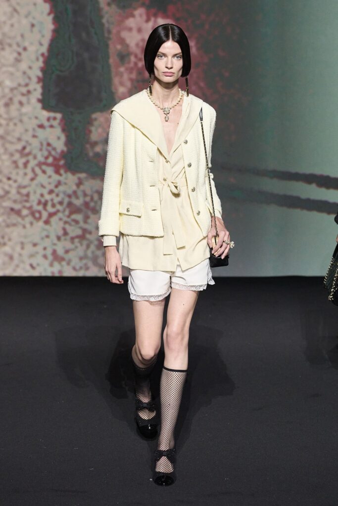 Το σορτς είναι ένα από τα απόλυτα κομμάτια της συλλογής, κι έρχονται σε συνδυασμό με ένα τουίντ γιλέκο και σακάκι. Αν η logomania είναι διακριτική, οι κάλτσες δεν είναι: ο οίκος συνδυάζει διακοσμημένα με studs διχτυωτά στυλ με τα δίχρωμα παπούτσια που δεν θα μπορούσαν να λείπουν από το “Πέρυσι στο Μάριενμπαντ”.