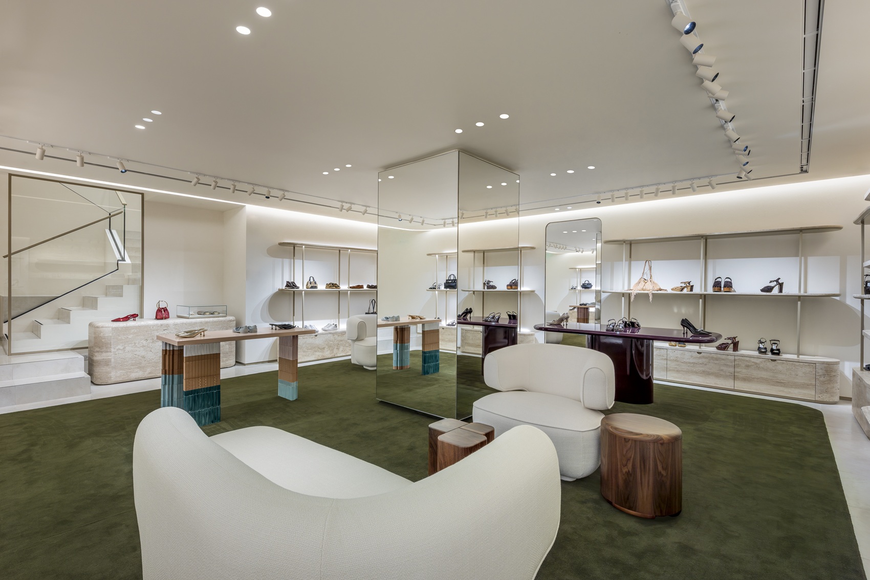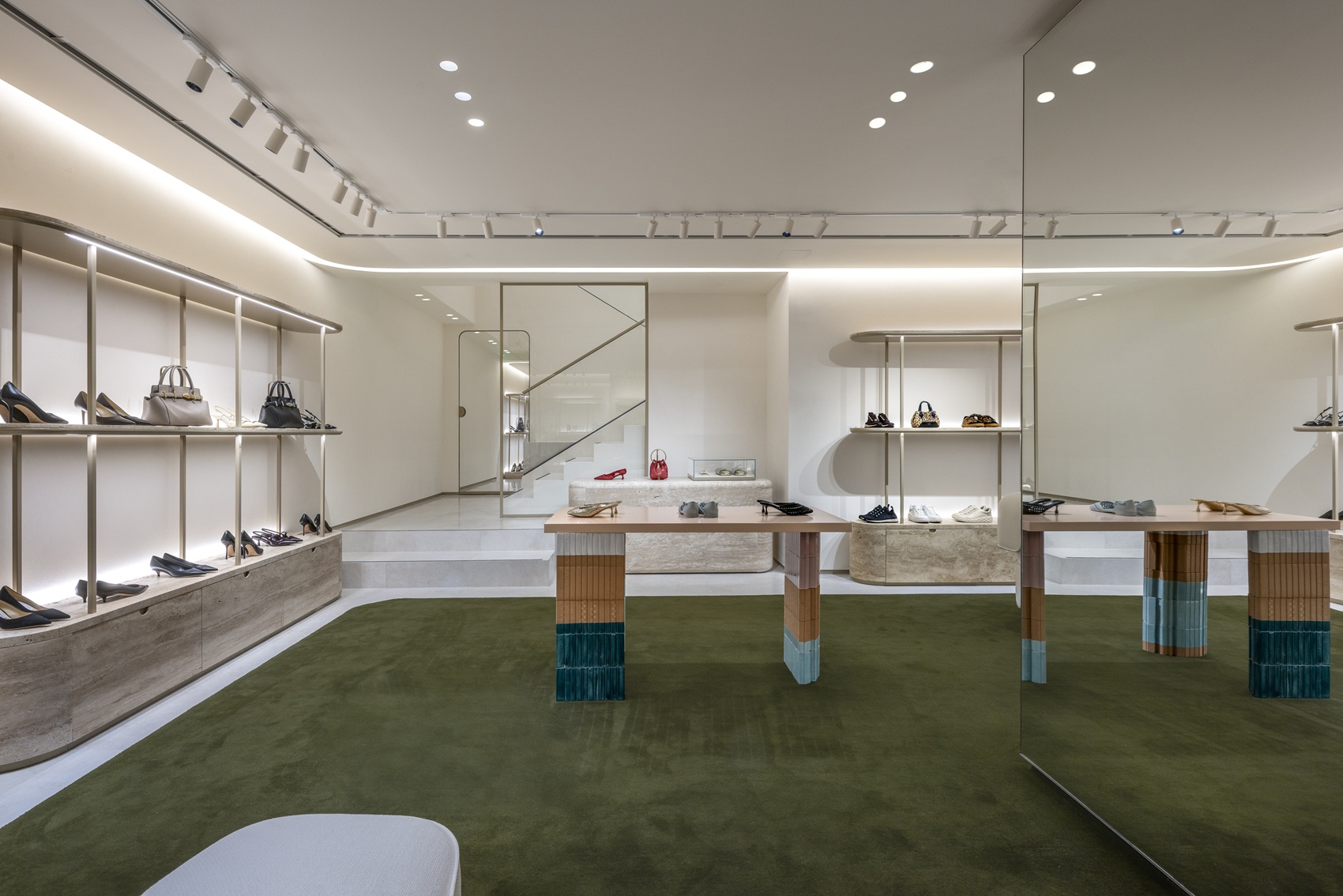 Με συνολική επιφάνεια 116 τ.μ., ο χώρος αποπνέει σύγχρονη πολυτέλεια μέσα από εκλεπτυσμένα υλικά: travertine marble ράφια, τραπέζια έκθεσης από ξύλο καρυδιάς, στοιχεία και πινελιές από ματ ορείχαλκου και δάπεδο από πορσελάνη. Πράσινα χαλιά και άνετοι χώροι αναμονής προσδίδουν ζεστασιά και οικειότητα, ενώ οι καθρέφτες ενισχύουν το φως και την αίσθηση ευρυχωρίας, δημιουργώντας μια φιλόξενη ατμόσφαιρα.