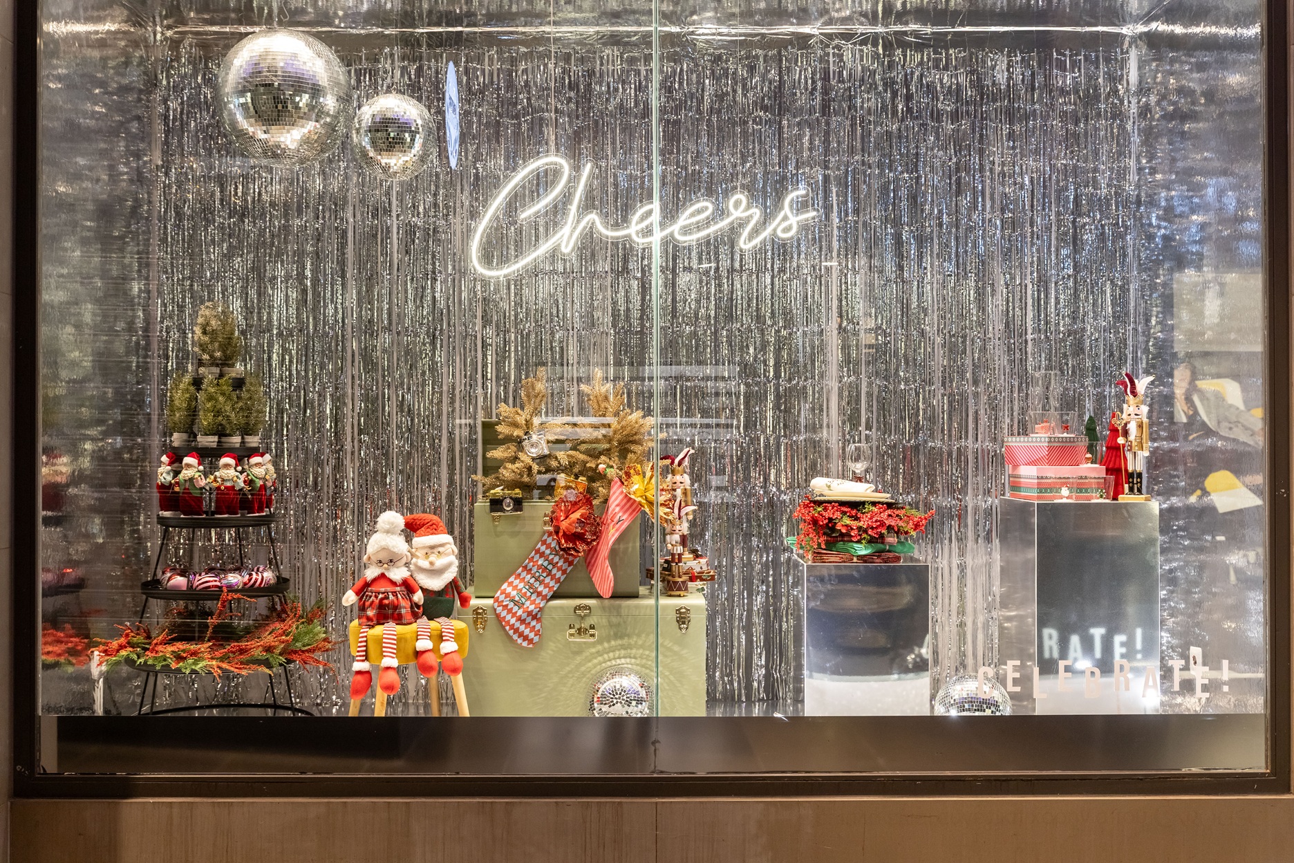 Εμπνευσμένο από την ασημένια παλέτα του modern glam και την ανεμελιά της disco αισθητικής, το concept συνδυάζει καθρεφτισμένες επιφάνειες, φωτεινές ασημένιες κουρτίνες, disco balls και neon λέξεις: dance, party, joy, magic, cheers, gifts. Λέξεις που αποτυπώνουν τον παλμό και το συναίσθημα των γιορτών: χορός, γιορτή, χαρά, μαγεία, ευχές και δώρα.
