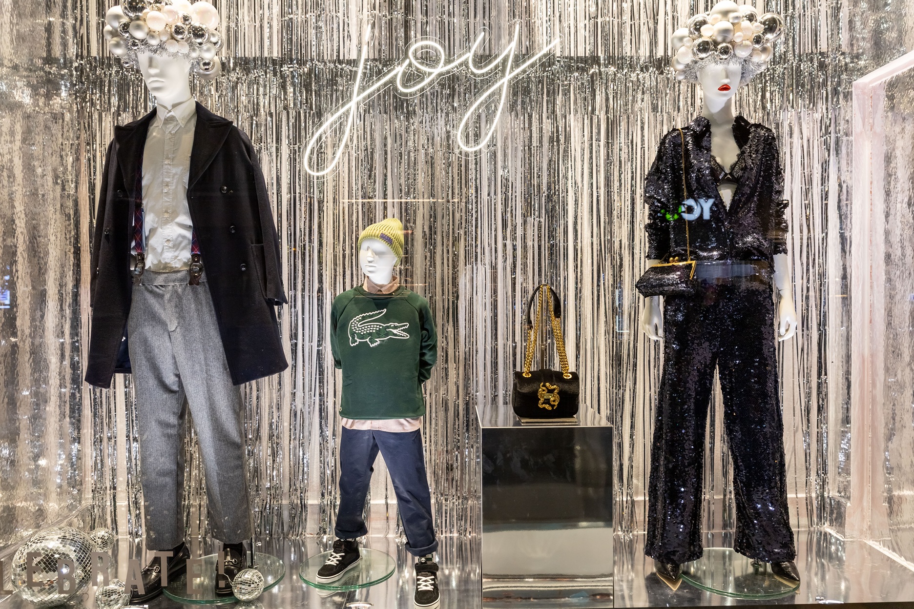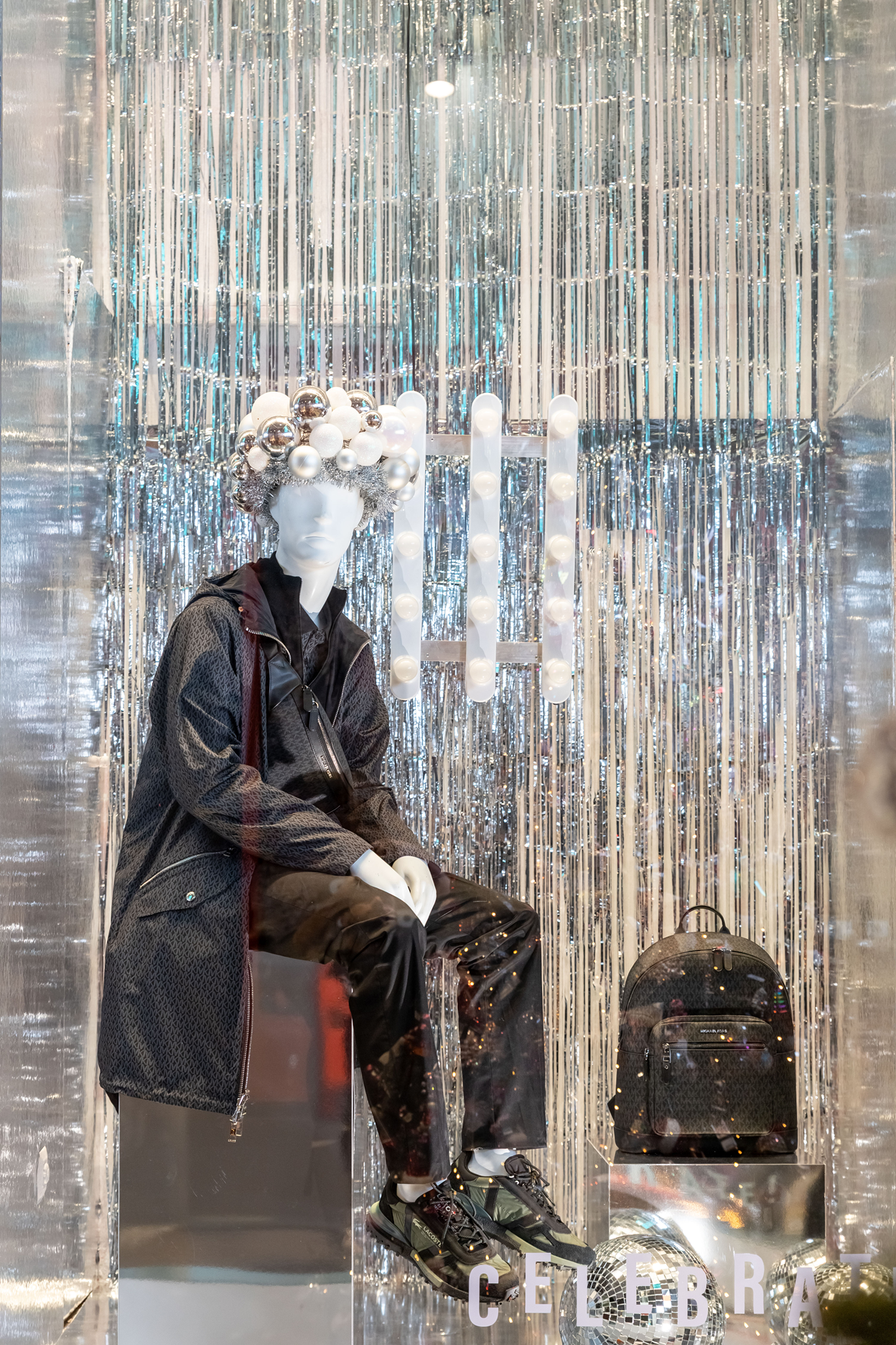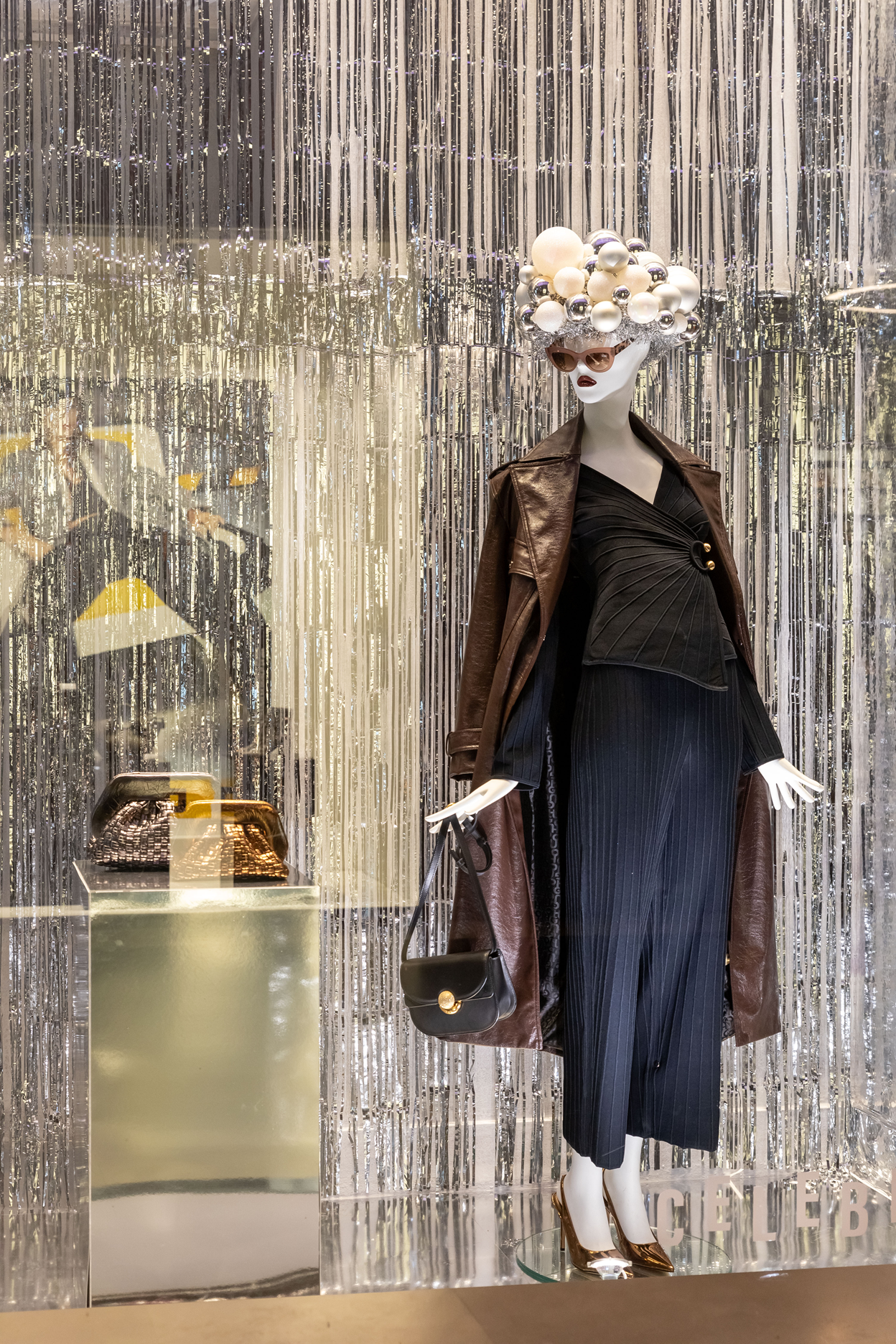Τα εντυπωσιακά headpieces των mannequins, ειδικές καλλιτεχνικές δημιουργίες από ασημένιες μπάλες και γιρλάντες, ολοκληρώνουν το σκηνικό με μια ιδιαίτερη, γιορτινή πινελιά υψηλής αισθητικής.