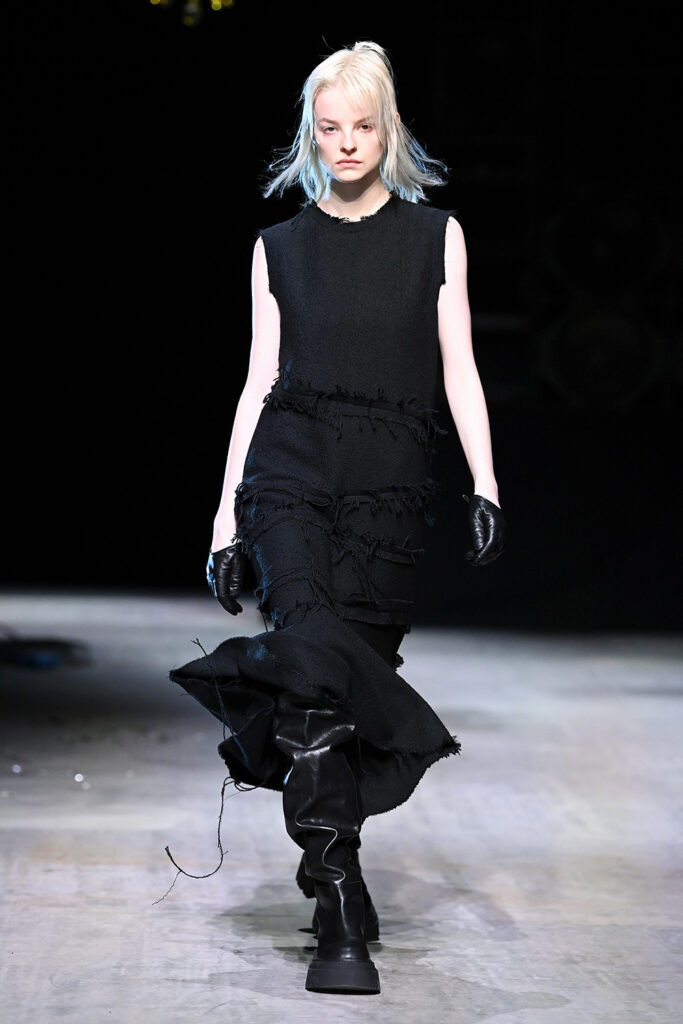 Το δέρμα διαδραματίζει εξέχοντα ρόλο και έχει χρησιμοποιηθεί σε φορέματα, μπουφάν, πουκάμισα και φούστες. Τα υλικά που δανείζονται από τον αρσενικό, sartorial κόσμο, κυμαίνονται από flannel σε pinstripe μαλλί, που συγκρούεται με μια καινοτόμο αίσθηση θηλυκότητας και ακατέργαστων υφών και άκρων, που ενισχύονται από κρόσσια και tie & dye τεχνικές με studs. Τα πλεκτά ενισχύονται από μια περίπλοκη αίσθηση διαφάνειας που επιτυγχάνεται μέσω μαλακών νημάτων μοχέρ.