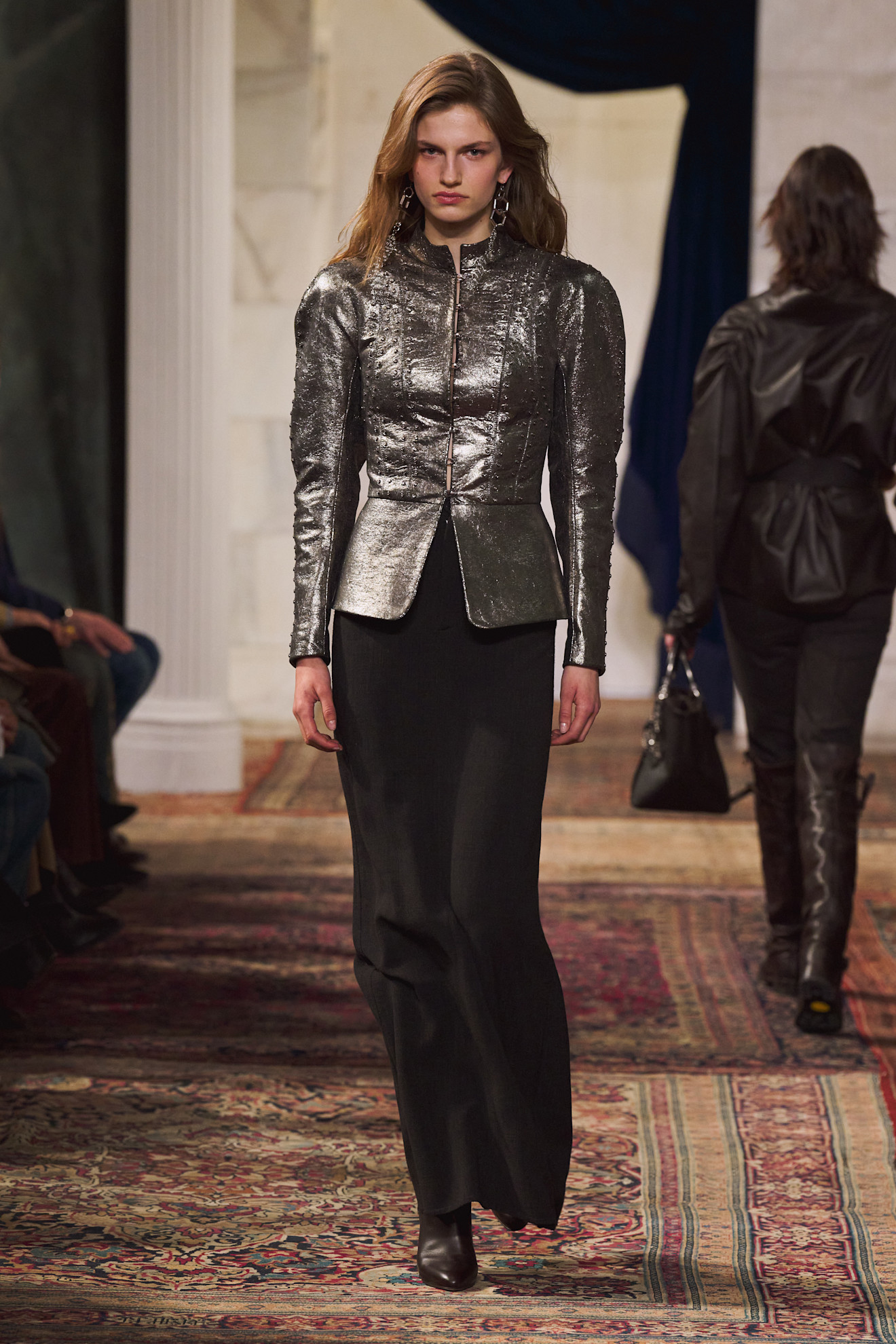 Το εναρκτήριο look, η Gigi Hadid με σκούρο πλεκτό ζιβάγκο, κορσέ και pencil φούστα από tweed, δεμένα με ζώνη από μεταλλικούς κρίκους έδωσε τον τόνο. Στη συνέχεια, η ραπτική και οι υφές συνυπήρχαν αρμονικά: σακάκια από φλοράλ ζακάρ συνδυάζονταν με δερμάτινα παντελόνια , μακριά παλτό «μαλάκωναν» με λεοπάρ πόντσο, πλεκτά φωτίζονταν από μεταλλικά κεντήματα. Δεν έλειψαν και οι αναφορές σε μια σύγχρονη «πανοπλία»: μια διάφανη τουνίκ με κουκούλα που έλαμπε σαν αλυσιδωτός θώρακας, σακάκια σε ασημί με έντονους ώμους, και βραδινές δημιουργίες που αντανακλούσαν το φως. Την ονειρική διάσταση της συλλογής γείωνε μια γήινη παλέτα από πράσινα του δάσους, γκρι της πέτρας και βαθιά καφέ.