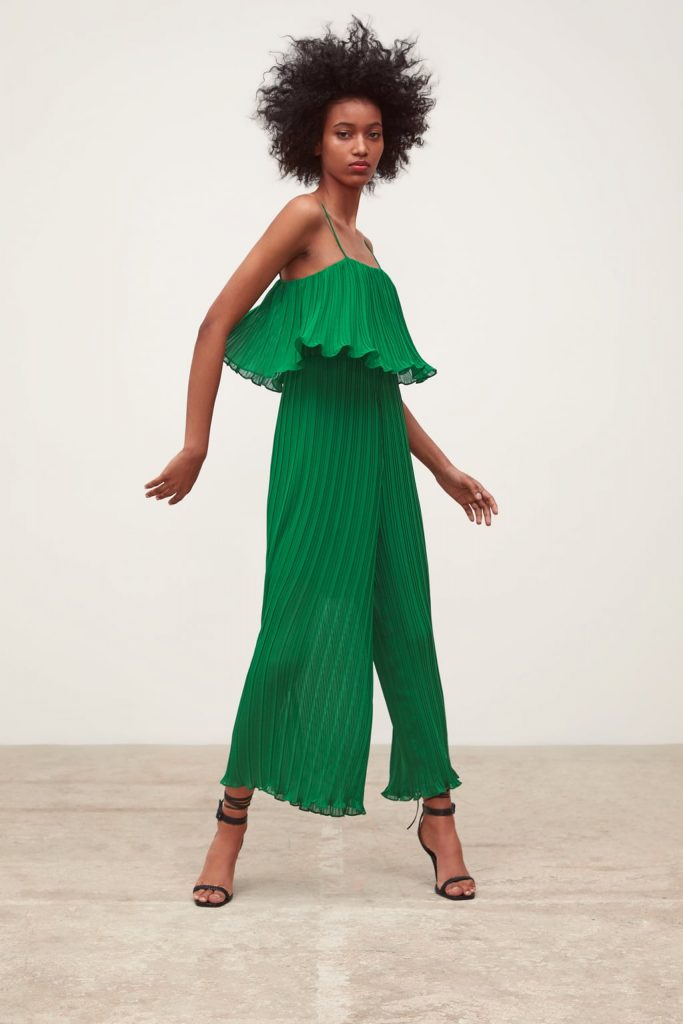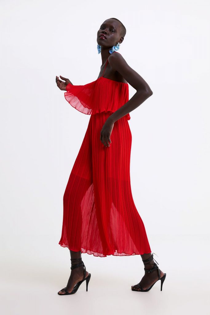 Περιγράφεται ως: “πλισέ ολόσωμη φόρμα με τιράντες” και διαθέτει ένα μεγάλο βολάν στο σημείο του στήθους, ελαστική μέση και επένδυση”.Έχει μια αρκετά χαλαρή εφαρμογή, ώστε να ξέρετε με σιγουριά ότι θα είναι πολύ άνετη και θα καλύψει επίσης οποιαδήποτε ατέλεια δεν θέλετε να εμφανίσετε.