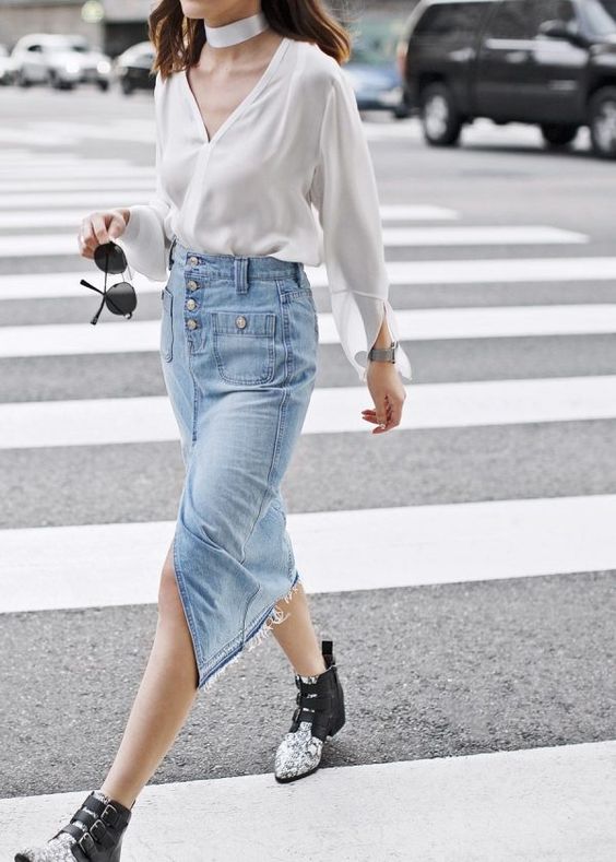 Συνδύασε ένα σατινέ τοπ με μια φούστα denim μεσαίου μήκους και ένα ζευγάρι φλατ ή με χαμηλό τετράγωνο τακούνι ankle boots. Μια ωραία τσάντα και ένα ζευγάρι γεωμετρικά σκουλαρίκια θα κάνουν την εμφάνιση über-modern.