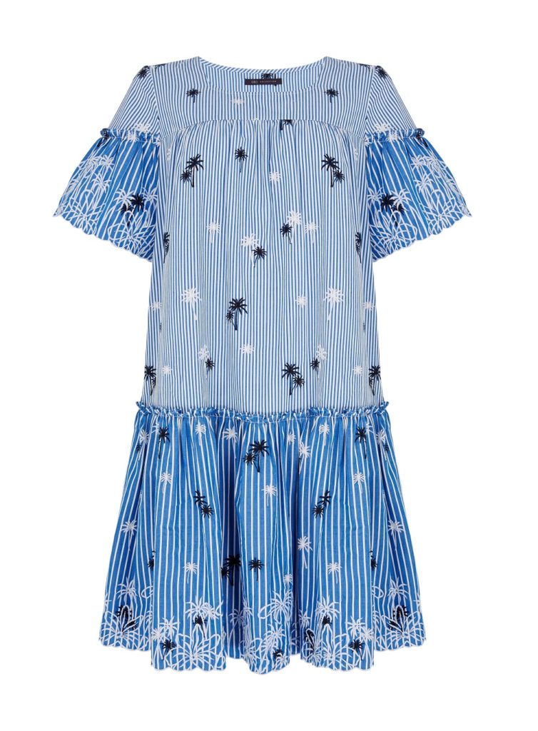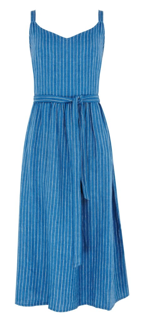 Σε μεσαίο μήκος, από αέρινο λινό, σε γαλάζιο χρώμα με λευκές ρίγες και ζώνη που τονίζει τη μέση έχει όλα τα απαραίτητα στοιχεία για να γίνει το φόρεμα του καλοκαιριού.