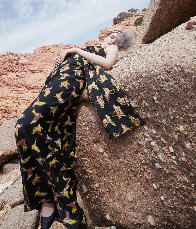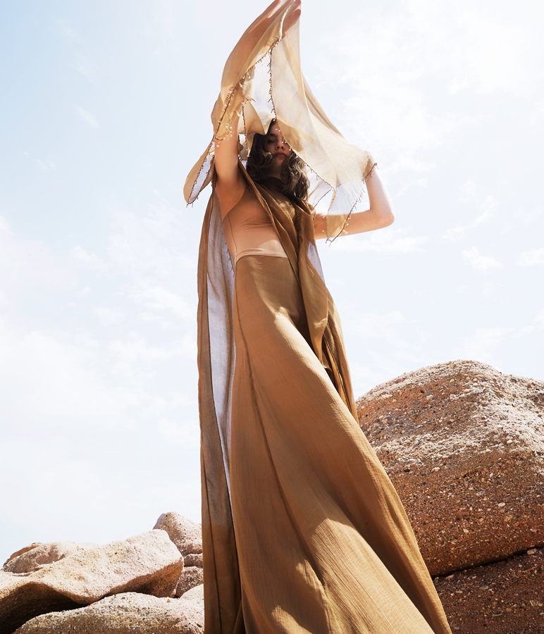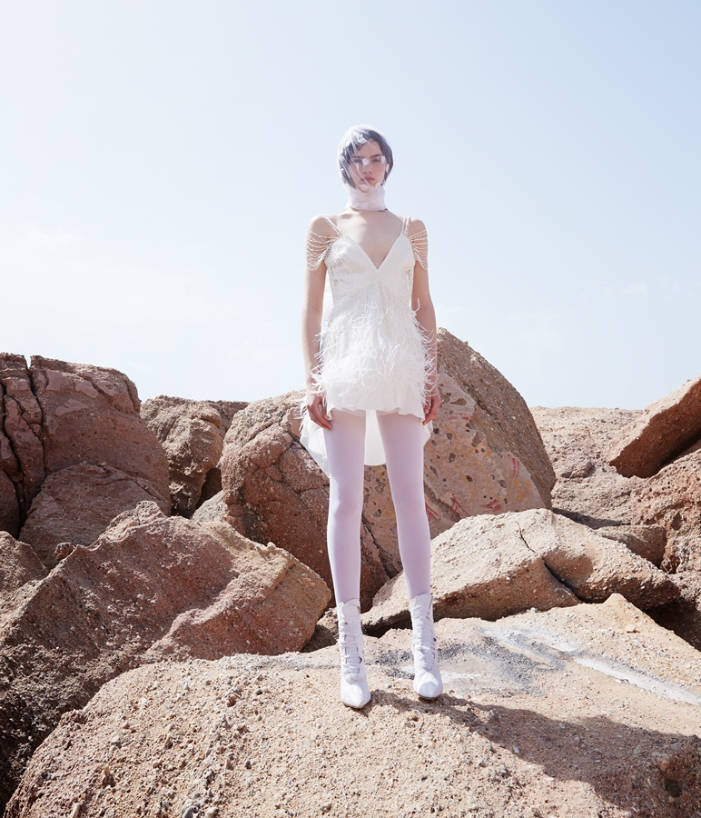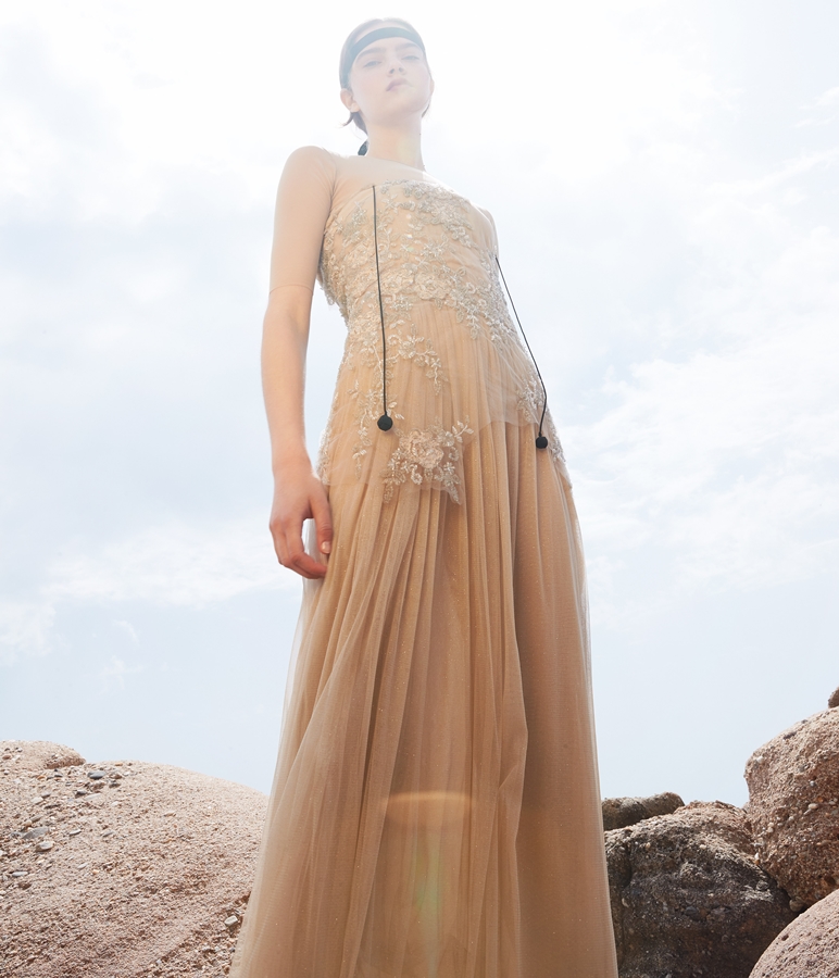 Τα υφάσματα είναι όλα μεταξωτά, διαφάνειες, λατρεμένες μουσελίνες ή φίνο washed satin (επεξεργασμένο, πετροπλυμένο σατέν). Οι πόρπες, οι κεντημένες τιράντες στο χέρι, τα κεντημένα με μικρά κρυσταλλάκια τελειώματα προκαλούν για χάδι. Τα ακουμπάς να νιώσεις την ενέργεια. Η χειροποίητη πολυτέλεια προσφέρει μια αλλόκοτη σιγουριά – σαν να νικάει το χρόνο.
