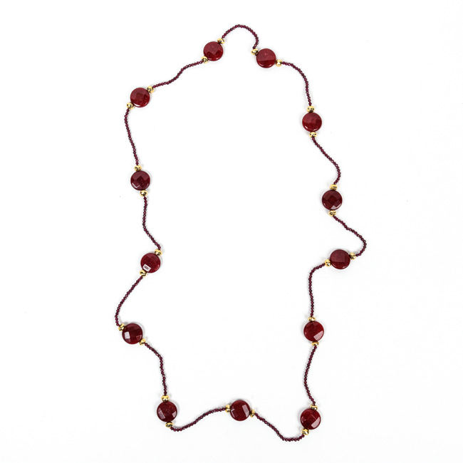 Μακρύ κολιέ διακοσμημένο με λυχνίτη σε όλο του το μήκος, σε ρουμπινί χρώμα.