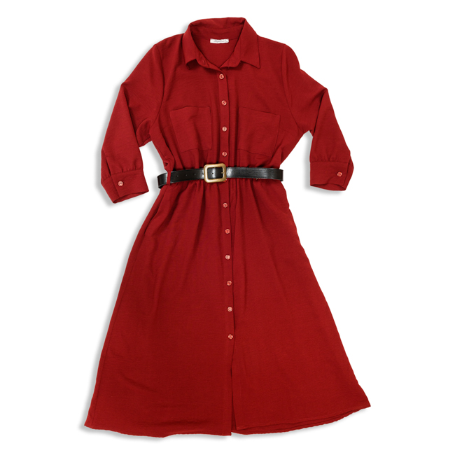 Midi φόρεμα με γιακά, μανίκια 3/4, ελαστική μέση, και faux δερμάτινη ζώνη. Ολοκλήρωσε το look με μπότες μέχρι το γόνατο ή τις αγαπημένες σου γόβες.