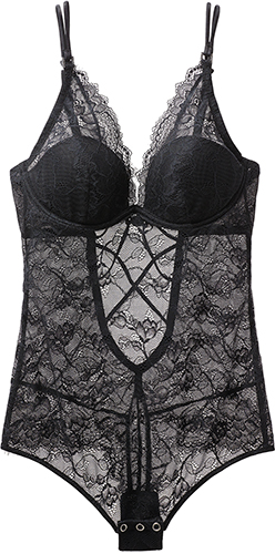 Μαύρο κορμάκι από δαντέλα με ελαφριά επένδυση και μπανέλα. Το πίσω μέρος είναι διακοσμημένο με διχτυωτό μοτίβο. Διαθέτει brazilian cut και βαμβακερό καβάλο.