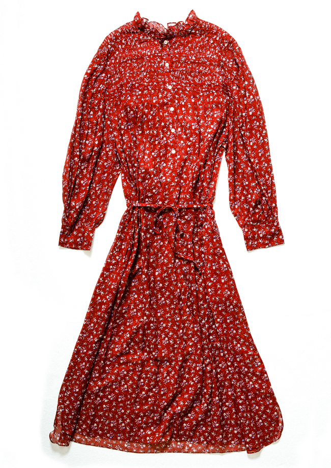 Μακρυμάνικο φόρεμα με floral τύπωμα με ψηλό λαιμό με βολάν, κουμπιά στο μπροστινό μέρος και ελαστική μέση. Σε κόκκινο χρώμα, ιδανικό για τις γιορτές και με ρομαντικό φλοράλ print.