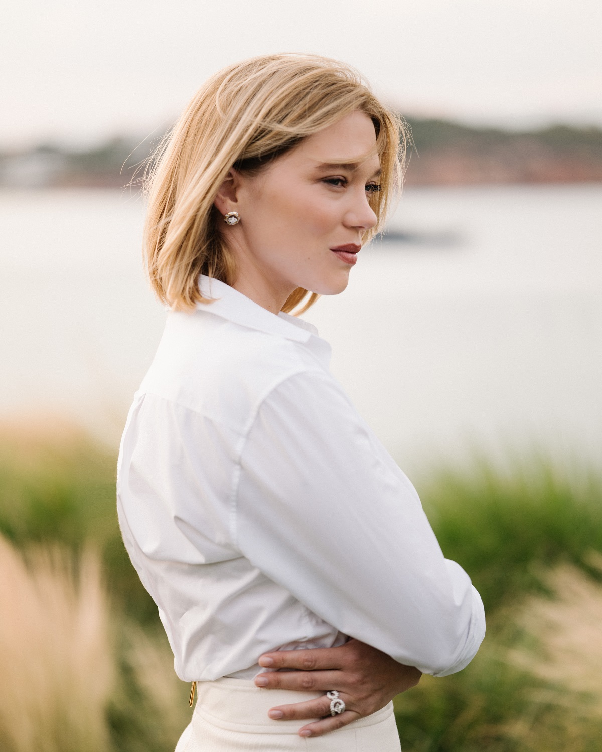 Η Léa Seydoux φόρεσε μια μίντι κρεμ φούστα και λευκό πουκάμισο με μαύρες γόβες και μια ασημί glass case. Φοράει επίσης ένα κολιέ από λευκό χρυσό και διαμάντια, δαχτυλίδια καθώς και σκουλαρίκια από λευκό και κίτρινο χρυσό από τις συλλογές Louis Vuitton High Jewellery.