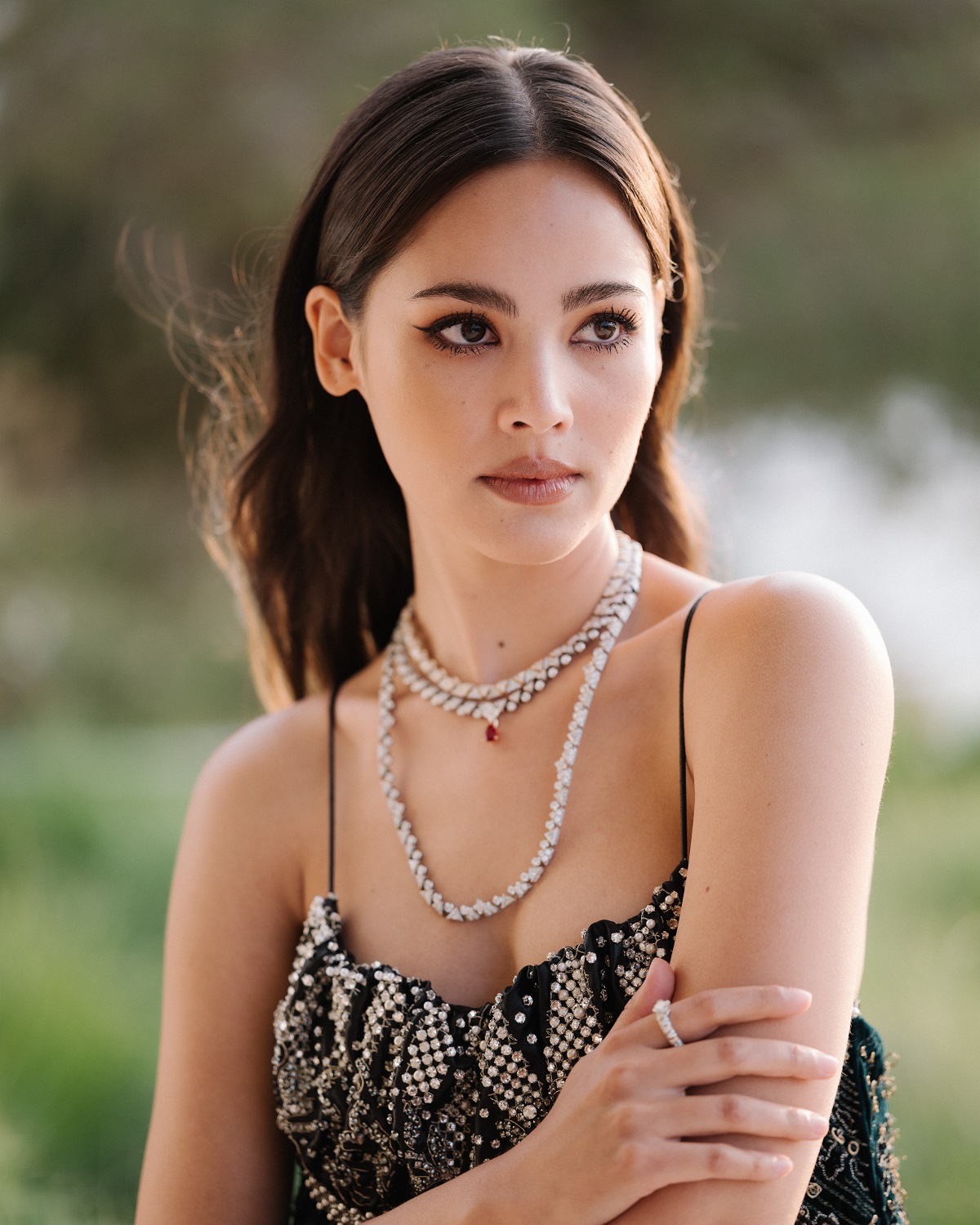 Η Urassaya Sperbund φόρεσε ένα μαύρο και ασημί κεντημένο φόρεμα, μαύρα πέδιλα και ένα μαύρο δερμάτινο Petite Malle. Φόρεσε επίσης ένα κολιέ από λευκό και ροζ χρυσό με ρουμπίνι και διαμάντια και ένα δαχτυλίδι από λευκό χρυσό και διαμάντια από τις συλλογές Louis Vuitton High Jewellery.