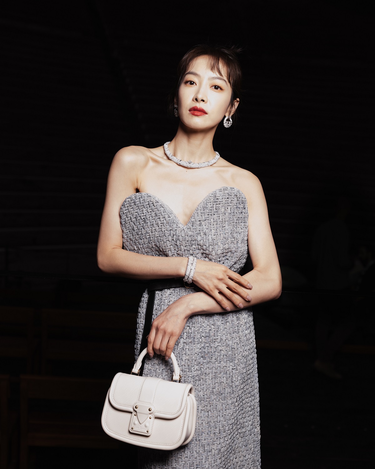 Η Victoria Song φόρεσε ένα γκρι μπουστάκι φόρεμα σε σχήμα καρδιάς με μαύρη δερμάτινη ζώνη, μαύρες γόβες και μια μπεζ τσάντα. Φόρεσε επίσης σκουλαρίκια από λευκό χρυσό και διαμάντια, βραχιόλι και κολιέ από τις συλλογές Louis Vuitton High Jewellery.