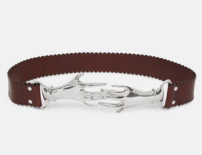 Το καφέ δερμάτινο αξεσουάρ έχει το πιο ασυνήθιστο κούμπωμα με δύο μεταλλικά χέρια να στερεώνονται μεταξύ τους στο μπροστινό μέρος.