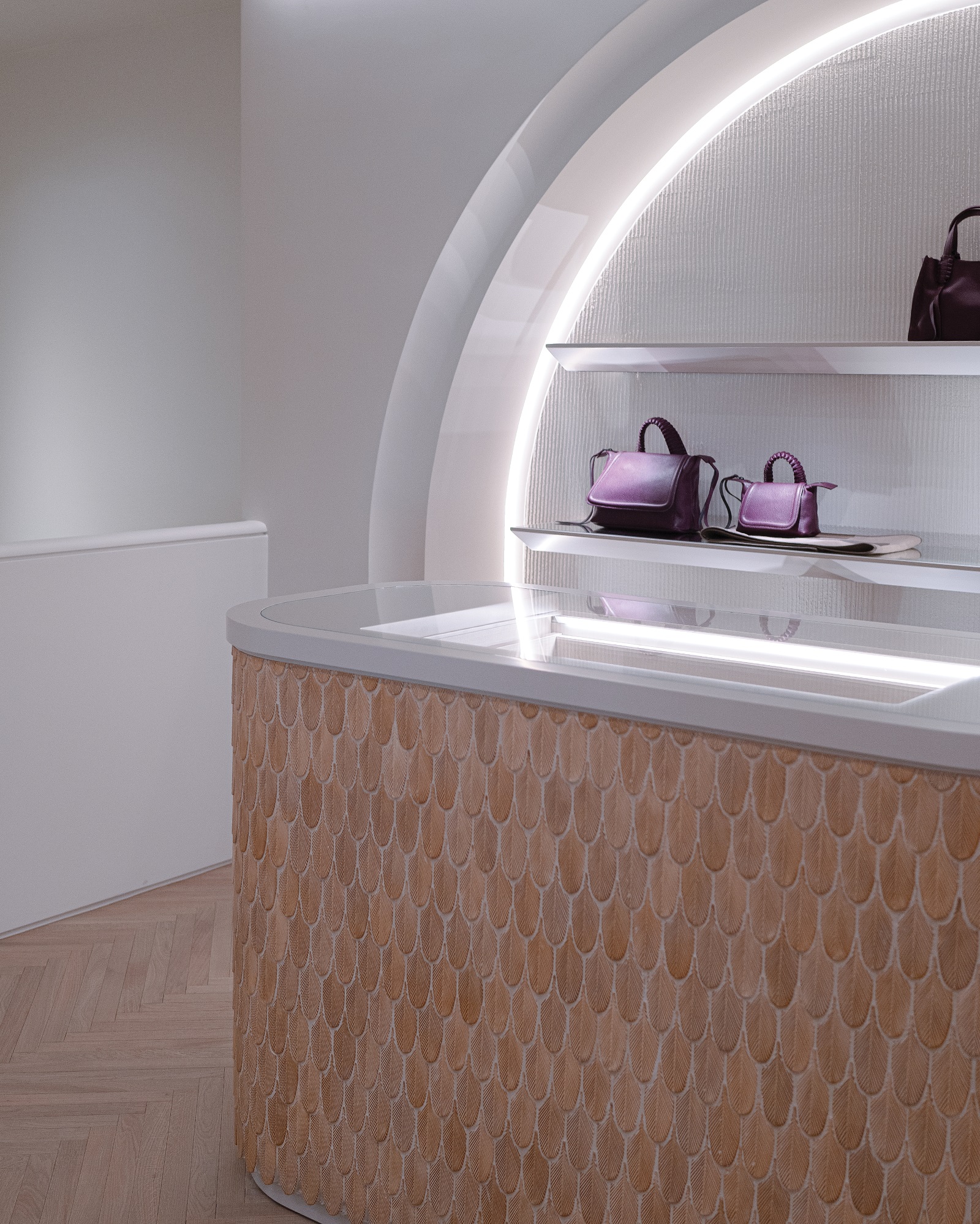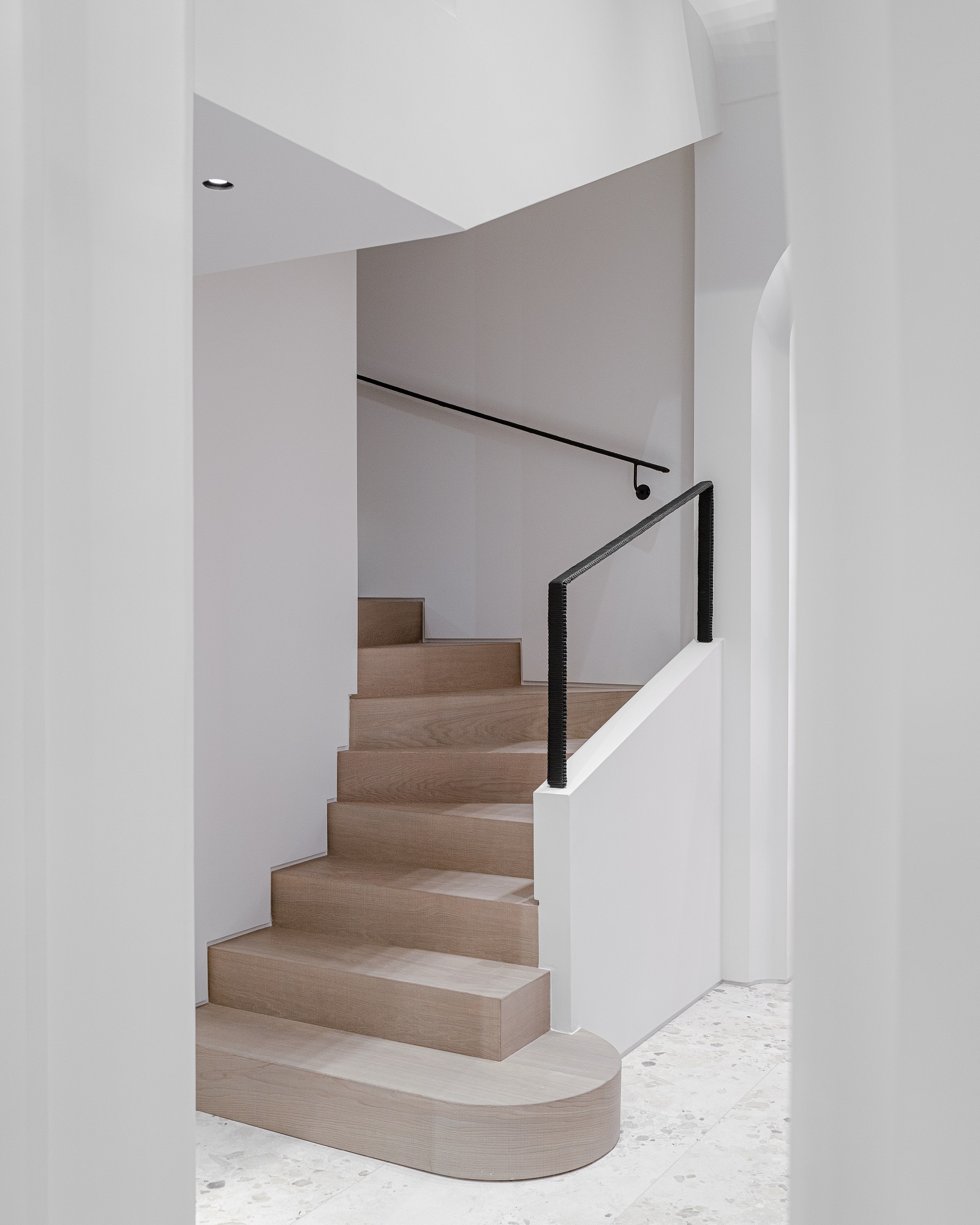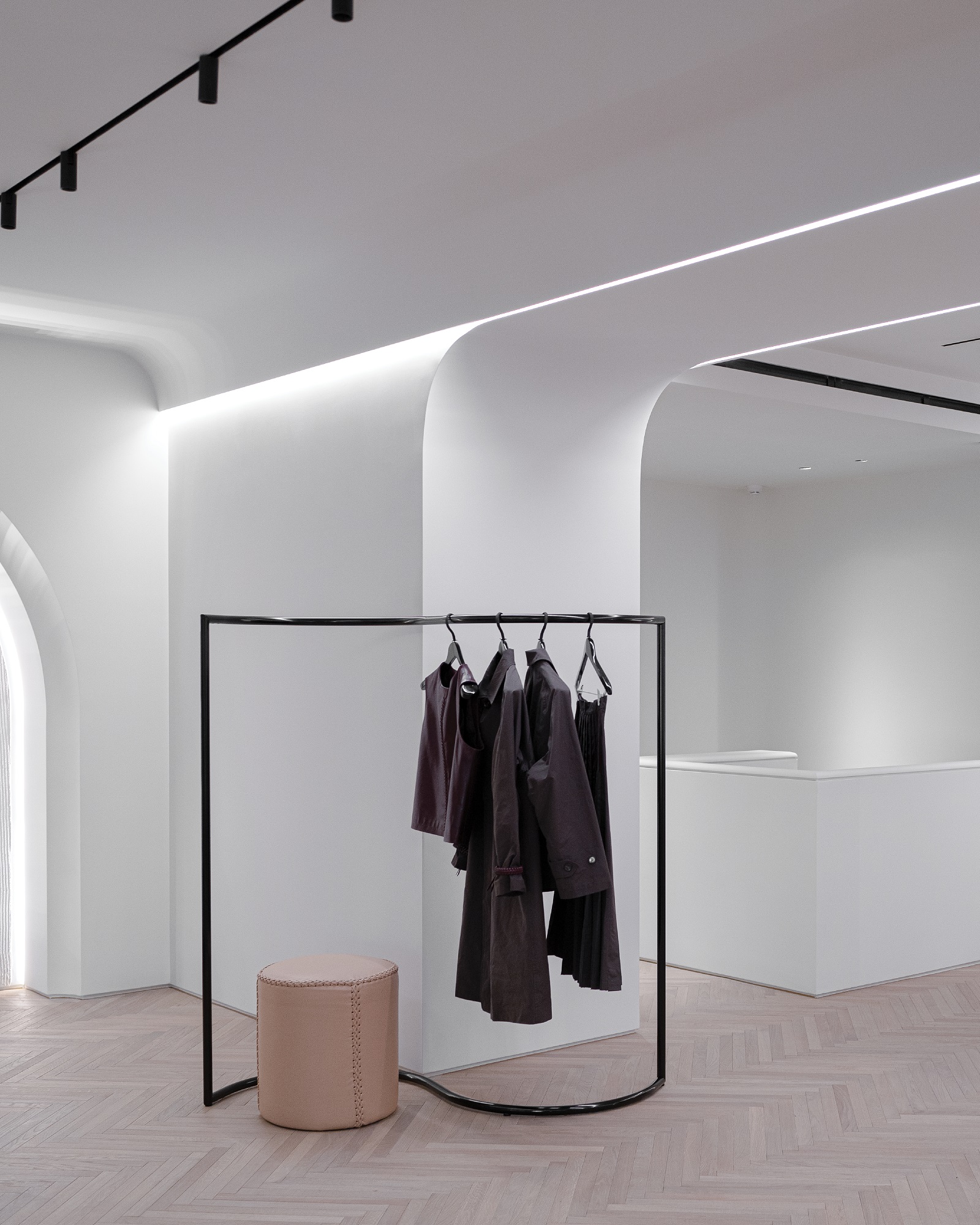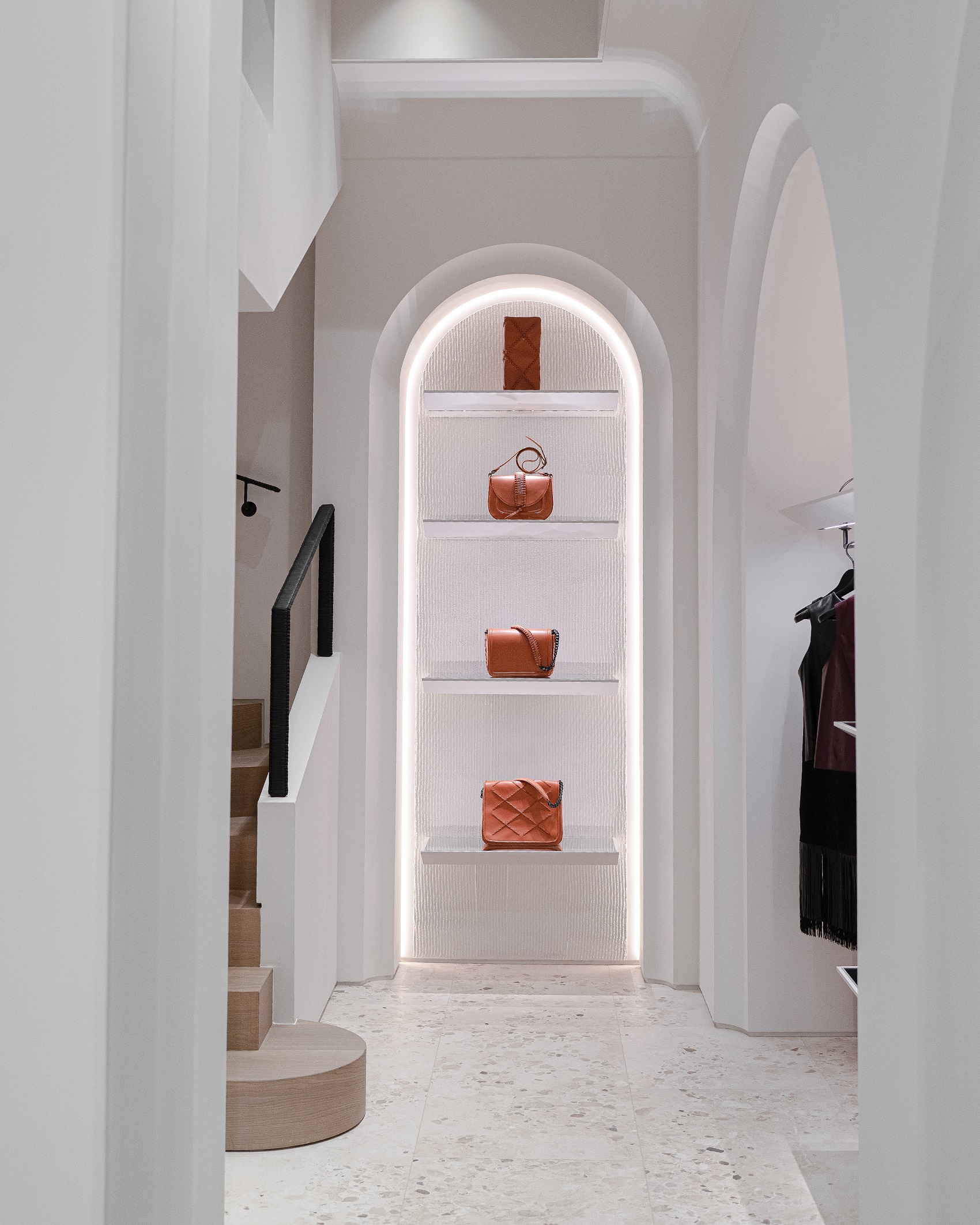 Η επιβλητική τοξωτή είσοδος δεσπόζει στο κατάστημα, αποτελώντας κεντρικό στοιχείο του εξωτερικού σχεδιασμού, ενώ οι καμάρες, με τις χαρακτηριστικές τους καμπύλες, συνεχίζουν την αισθητική αυτή και στο εσωτερικό, αγκαλιάζοντας τόσο το ισόγειο όσο και τον πρώτο όροφο. Η προσέγγιση του interior design αποπνέει αρμονία, με μια γήινη παλέτα χρωμάτων σε ουδέτερους τόνους που αναδεικνύονται μέσα από φυσικά υλικά, όπως η πέτρα, το ξύλο και το εντυπωσιακό ψαροκόκαλο χαρακτηριστικό των νεοκλασικών κτιρίων την εποχής, δημιουργώντας μια αίσθηση μινιμαλισμού.