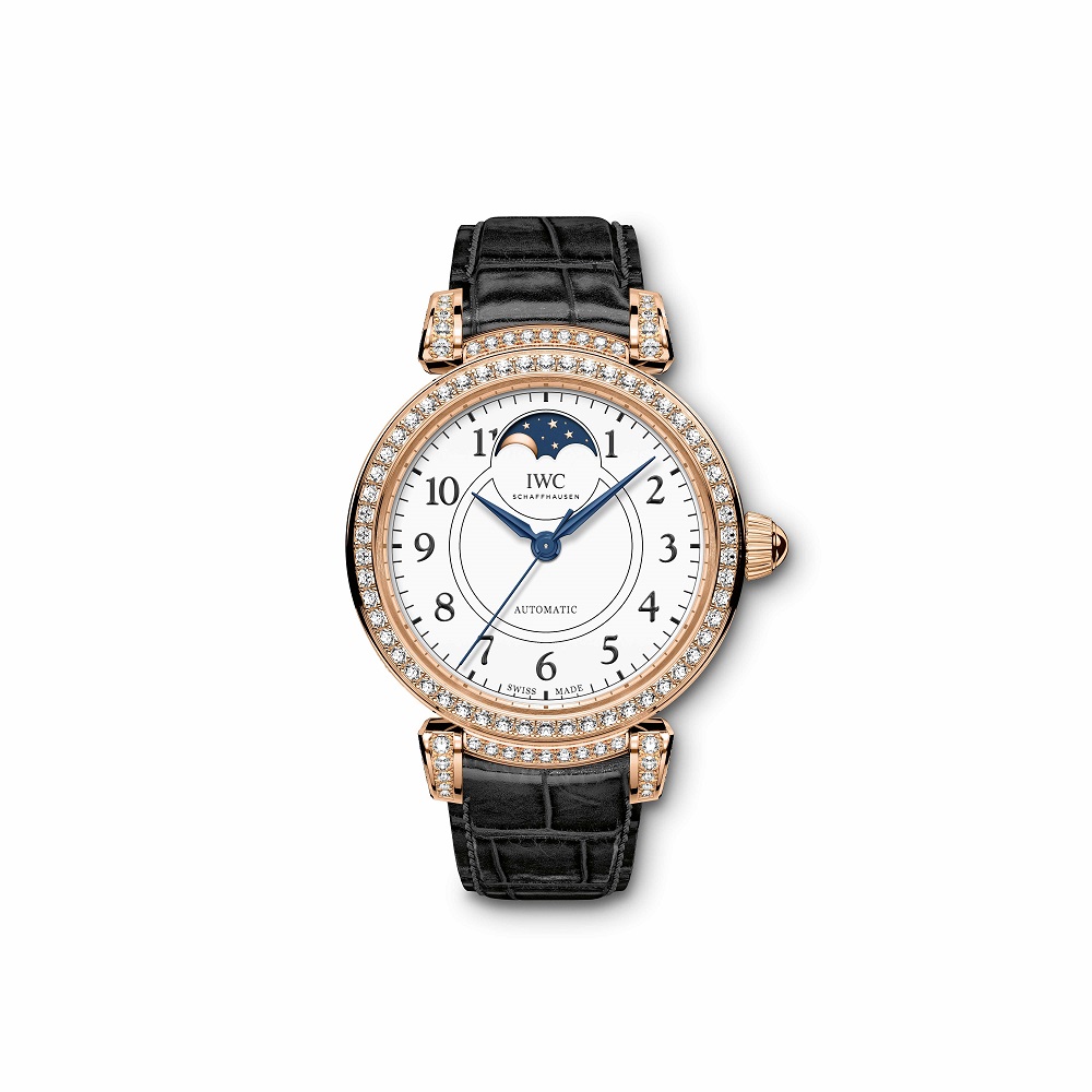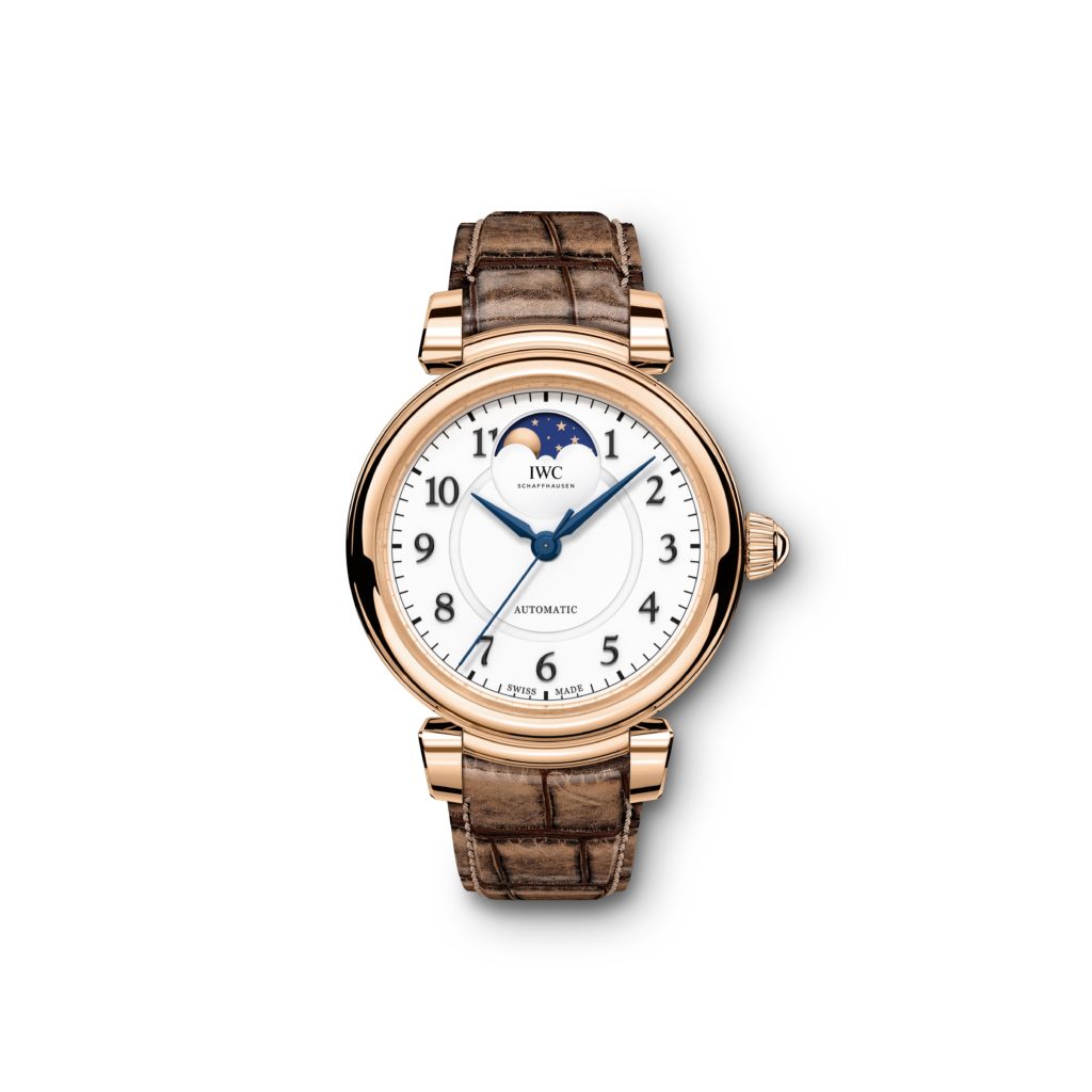 Λουράκι από δέρμα αλιγάτορα σε καφέ χρώμα, κάσα από ροζ χρυσό και επάργυρο καντράν συνθέτουν ένα κομψό και μοναδικό ρολόι ενώ η ένδειξη της φάσης της σελήνης του χαρίζει την αίσθηση της αρμονίας. Η IWC συνδυάζει τόλμη και κομψότητα να δημιουργήσει ένα ρολόι που είναι τόσο πρωτότυπο και καινοτόμο όσο η γυναίκα που το φοράει.