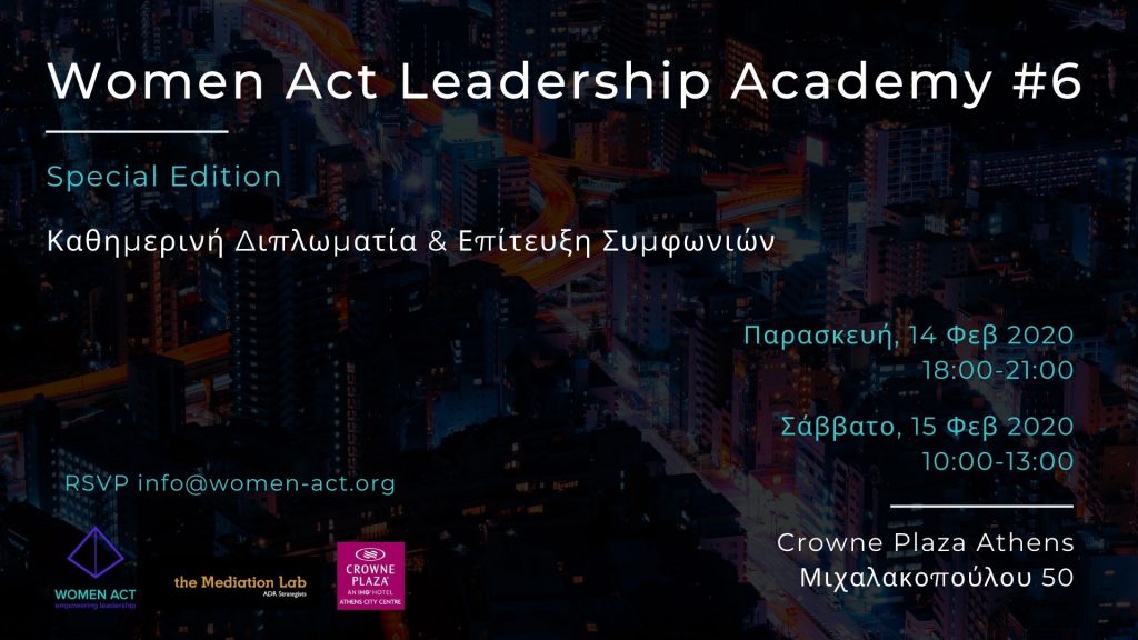 H Women Act, ο φορέας που στοχεύει σταθερά στην ενθάρρυνση των γυναικών που επιθυμούν να διεκδικήσουν θέσεις ηγεσίας και να εμπλακούν ενεργά στο δημόσιο χώρο, διοργανώνει στις 14 & 15 Φεβρουαρίου διήμερη Ακαδημία Ηγεσίας και σε συνεργασία με το αναγνωρισμένο MediationLab, και προσκαλεί όλες τις γυναίκες σε ένα μοναδικό workshop αφιερωμένo στην τέχνη της διαμεσολάβησης και των διαπραγματεύσεων σε επαγγελματικό αλλά και προσωπικό επίπεδο.