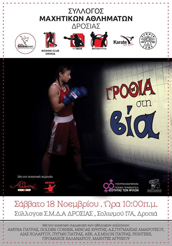 Πρόκειται για μια συνάντηση, ομαδική προπόνηση γυναικών που ασχολούνται με την πυγμαχία ανάμεσά τους και η πανελλήνια πρωταθλήτρια Κατερίνα Κουτσογεωργοπούλου, οι οποίες θα περάσουν, σε συνεργασία με την Γενική Γραμματεία Ισότητας των φύλων και το Δήμο Διονύσου, ένα ηχηρό μήνυμα κατά της κακοποίησης των γυναικών.