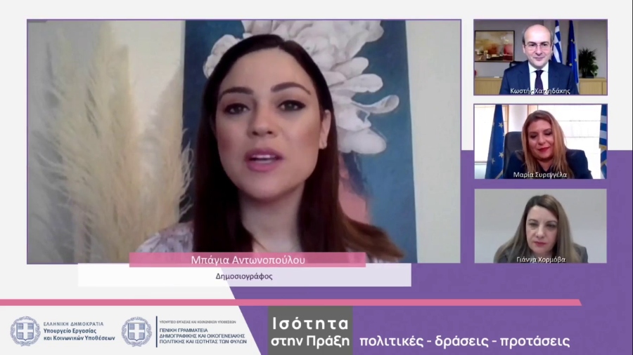 Σειρά δράσεων και μέτρων για την προώθηση της Ισότητας των Φύλων ανακοίνωσε χθες η πολιτική ηγεσία του Υπουργείου Εργασίας και Κοινωνικών Υποθέσεων κατά την διαδικτυακή εκδήλωση «Ισότητα στην Πράξη», με αφορμή την Παγκόσμια Ημέρα της Γυναίκας. Στην εκδήλωση συμμετείχαν ο Υπουργός Εργασίας και Κοινωνικών Υποθέσεων, Κωστής Χατζηδάκης, η Υφυπουργός, αρμόδια για τη Δημογραφική Πολιτική και την Οικογένεια, Μαρία Συρεγγέλα και η Γενική Γραμματέας Δημογραφικής και Οικογενειακής Πολιτικής και Ισότητας των Φύλων, Γιάννα Χορμόβα.
