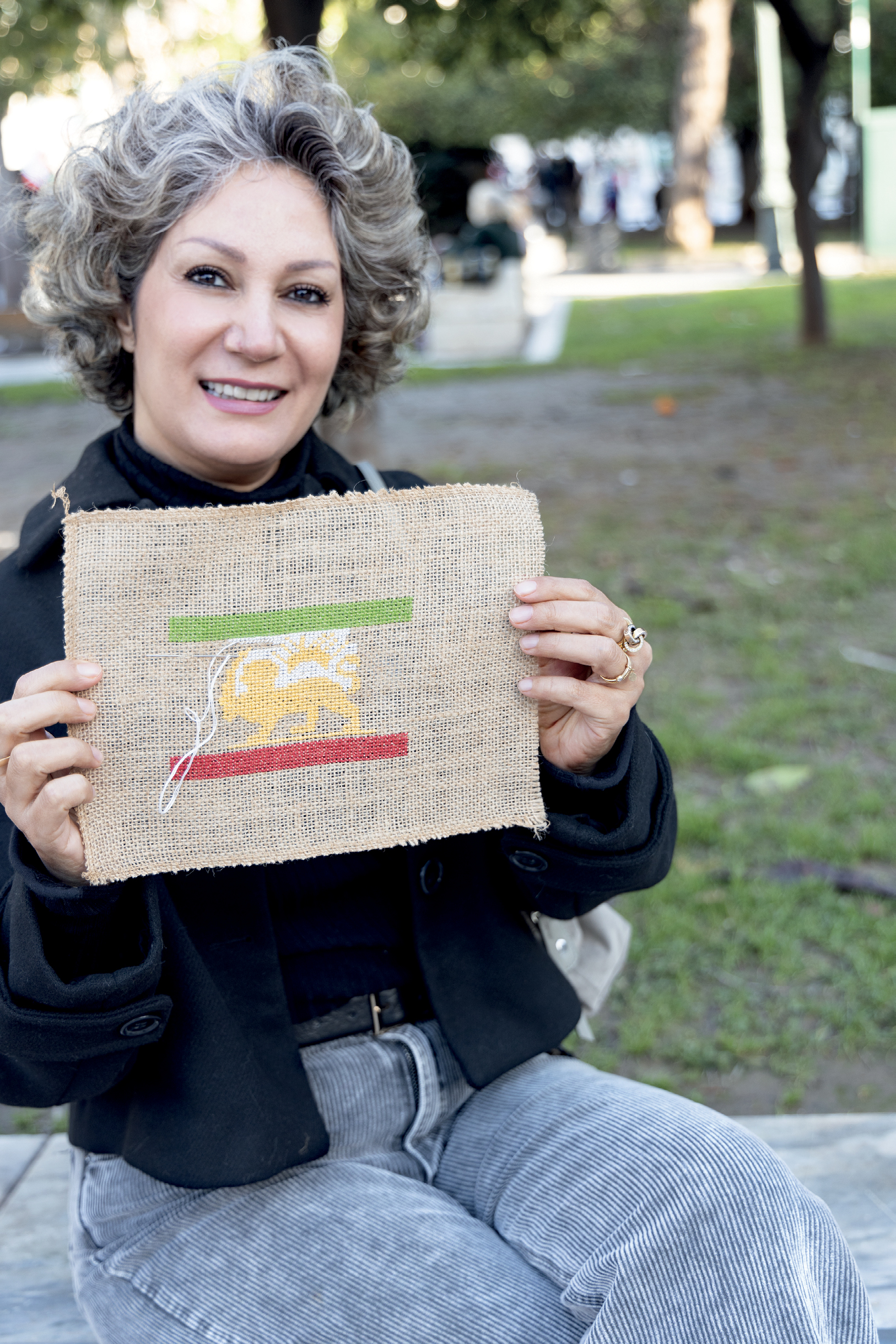 Αυτή την περίοδο κεντάω την παλιά σημαία του Ιράν. Οταν ήρθαν οι μουλάδες την άλλαξαν και έβαλαν στο κέντρο μια αραβική φράση -«ο Θεός είναι μεγάλος»-, κάτι που δεν έχει καμία σχέση ούτε με τη γλώσσα, ούτε με τις πεποιθήσεις μας. Το λιοντάρι και ο ήλιος που κεντάω είναι αρχαία σύμβολα του Ιράν που υπήρχαν πολύ πριν από το καθεστώς. Οταν κεντάω αυτή τη σημαία, δεν είναι απλώς ένα σχέδιο. Είναι ένας τρόπος να κρατάω ζωντανή τη μνήμη, την ταυτότητα και την ιστορία μας. Αυτό που υπήρχε πριν. Αυτό που μας ανήκει. Αν έπρεπε να κεντήσω ένα σύμβολο ελευθερίας, θα ήταν μια γυναίκα με μακριά μαλλιά, ελεύθερα, να κυματίζουν στον άνεμο. Και αν κεντούσα μια ευχή για το μέλλον, θα κεντούσα τον χάρτη του Ιράν. Για να μη διαλυθεί. Να μείνει όπως είναι. Σαν γάτα. Πιστεύουμε και θέλουμε πάρα πολύ να σωθεί.