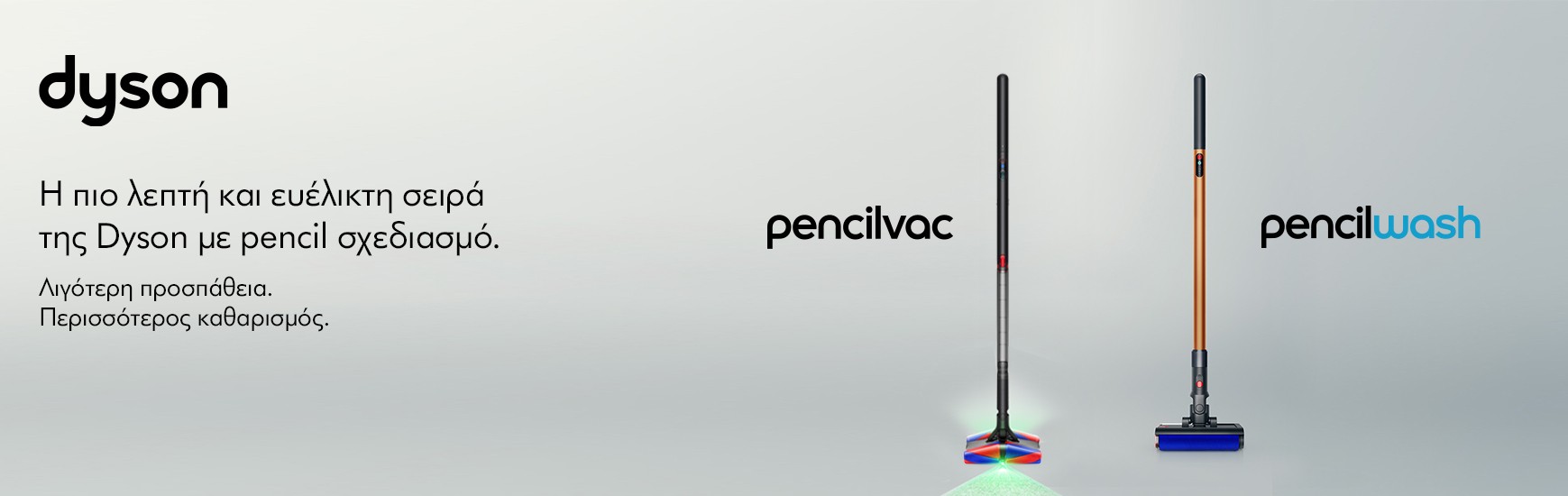 Το καθάρισμα του σπιτιού ή και κάθε χώρου όπου περνάμε σημαντικό μέρος του χρόνου μας, καθορίζει σε μεγάλο βαθμό την ποιότητα ζωής μας και οι δύο νέες κυκλοφορίες της Dyson, PencilVac και PencilWash, δυο ραβδιά με «μαγικές» προεκτάσεις, γίνονται οι καλύτεροι σύμμαχοί μας στην καθημερινή μας προσπάθεια γι΄ αυτό το αποτέλεσμα. Το μόνο που χρειάζεται να κάνουμε εμείς είναι να τα κρατήσουμε στα χέρια μας.