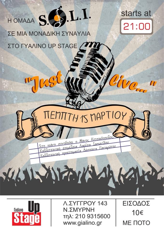 Η ομάδα SOLI ετοίμασε ένα live σε pop-rock κλίμα, με κομμάτια που επιλέχτηκαν από τα ίδια τα παιδιά. Με το νεανικό τους πνεύμα και χαρά θα παρουσιάσουν το προγραμμα αυτό, προσπαθώντας για το καλύτερο αποτέλεσμα όντας Students of Larisa Iasonidou.???