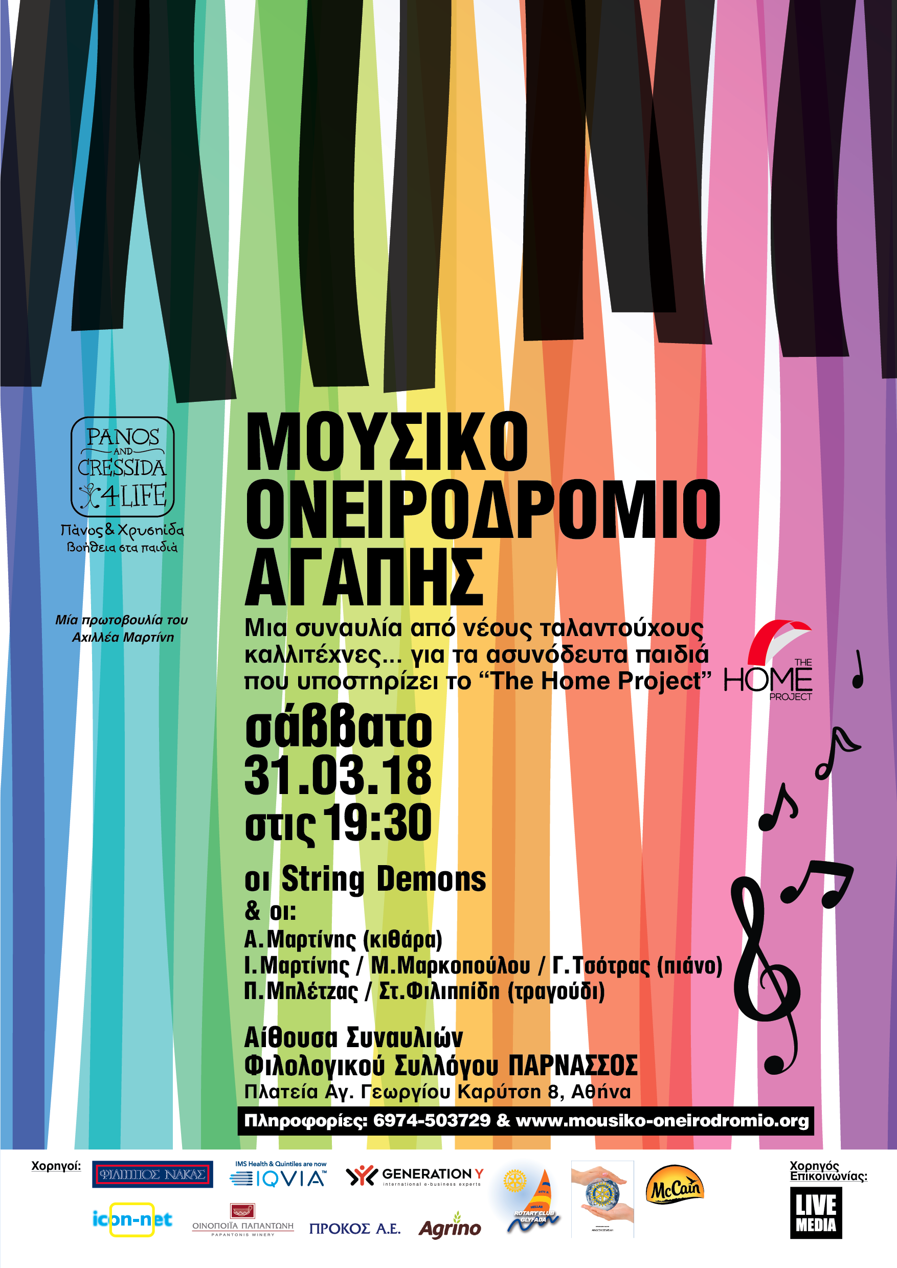 Φιλανθρωπική συναυλία με τίτλο “Μουσικό Ονειροδρόμιο Αγάπης” διοργανώνει ο 16χρονος Αχιλλέας Μαρτίνης , σε συνεργασία με τη μη κερδοσκοπική οργάνωση «Panos&Cressida 4 Life», το Σάββατο 31 Μαρτίου, ώρα 19:30, στη Συναυλιακή Αίθουσα Φιλολογικού Συλλόγου «Παρνασσός» (Πλατεία Αγίου Γεωργίου Καρύτση 8, 105 61 Αθήνα). Στη συναυλία θα συμμετέχουν νέοι ταλαντούχοι καλλιτέχνες, επαγγελματίες και μη, που θα τραγουδήσουν, θα παίξουν βιολί, βιολοντσέλο, κιθάρα και πιάνο σε κλασικά και μοντέρνα μουσικά κομμάτια .