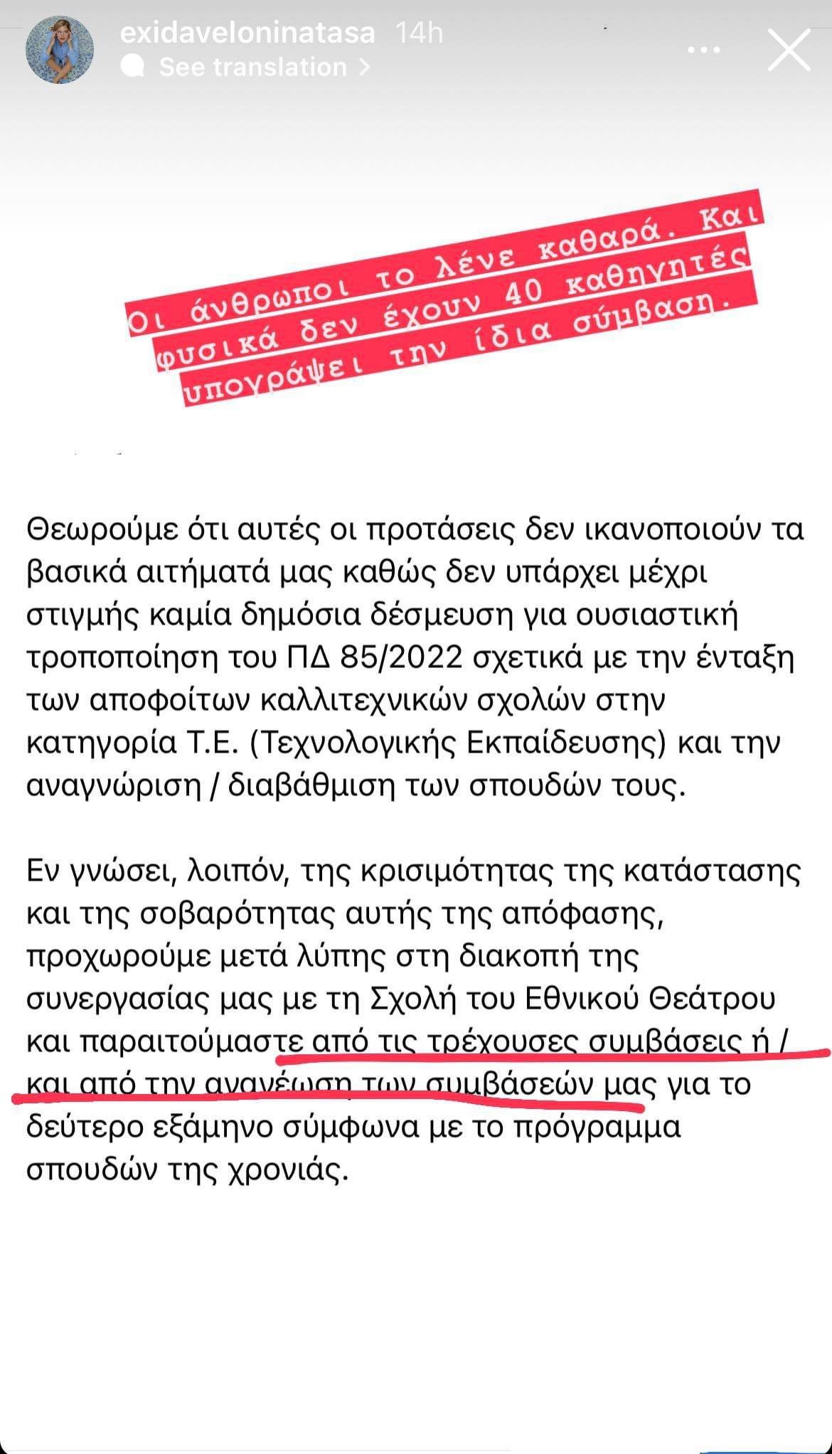Το Από Κοινού – Σωματείο Ελλήνων Ηθοποιών έγραψε στα social media αναφερόμενο στα μέσα που αναπαρήγαγαν πως οι συμβάσεις των καθηγητών έχουν λήξει: “Oι καθηγητές του Εθνικού Θεάτρου παραιτήθηκαν από την ανανέωση των εξάμηνων συμβάσεών τους.”