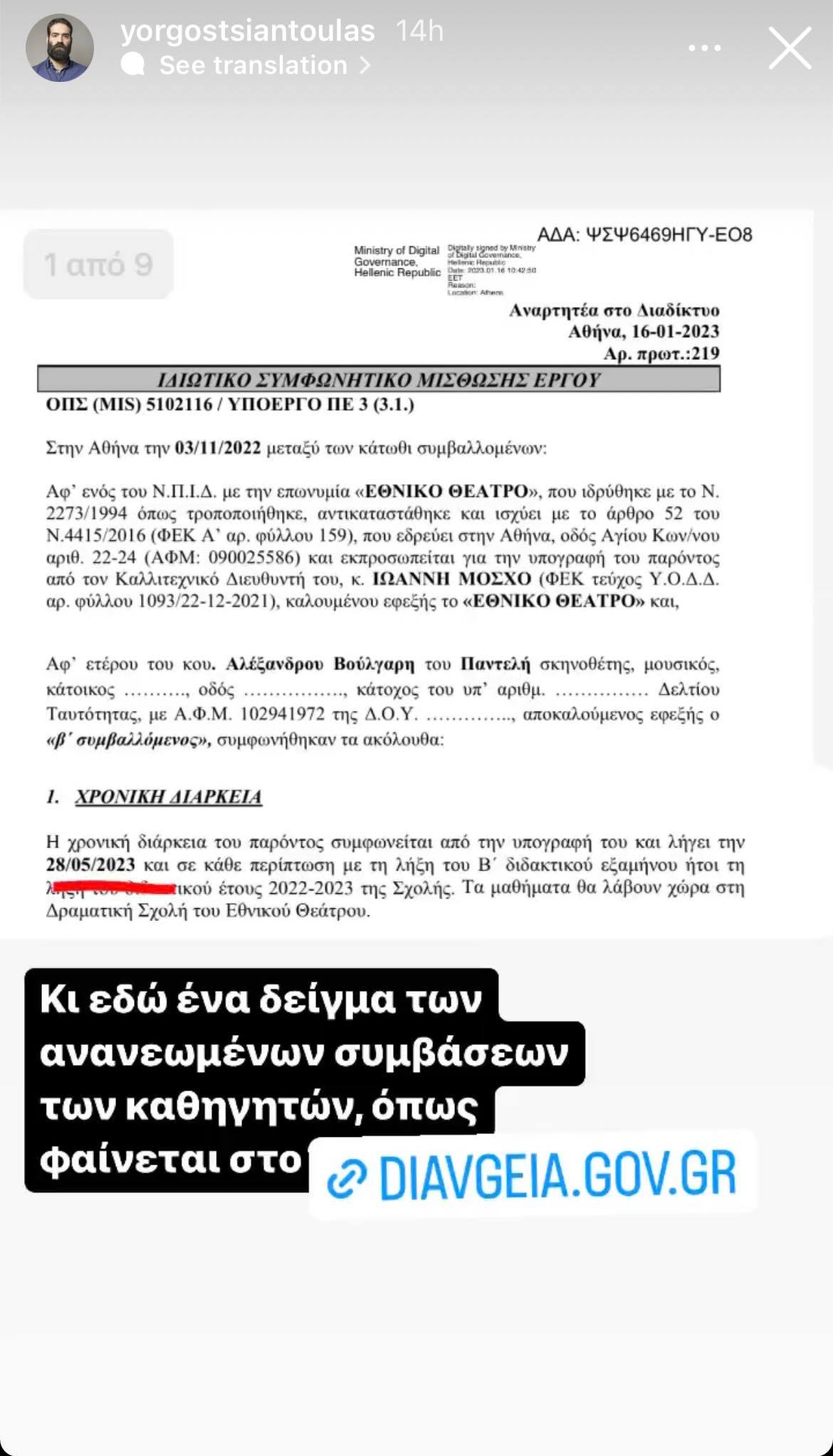 Για του λόγου το αληθές, παρακάτω ο ηθοποιός Γιώργος Τσιαντούλας, δημοσίευσε την ανανεωμένη σύμβαση του παρατηθέντος καθηγητή Αλέξανδρου Βούλγαρη, η οποία έληγε στις 28/05/2023.