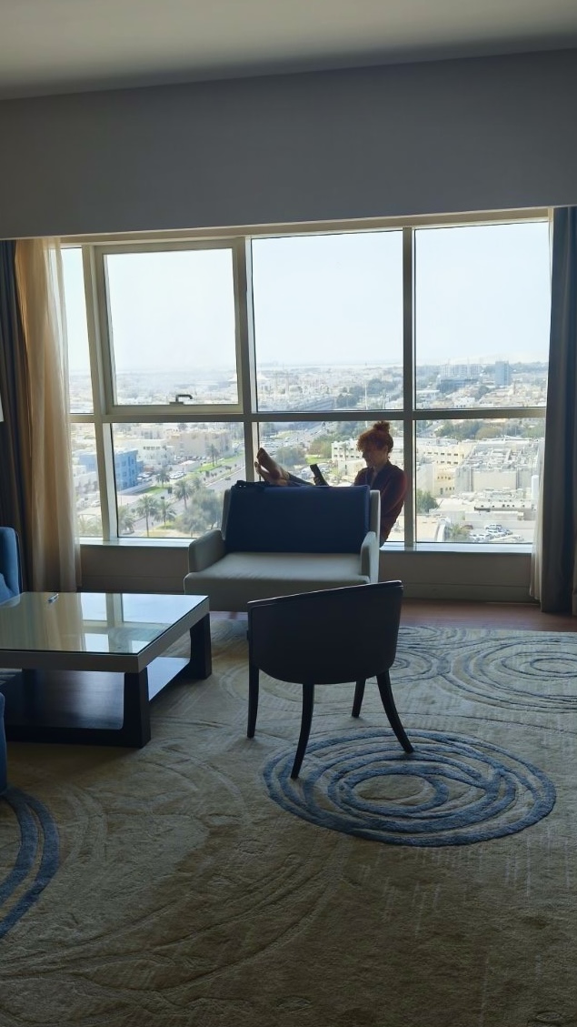 »Στηθήκαμε σε ατελείωτες ουρές, γιατί μας έπαιρναν με ό,τι μέσο μπορούσαν, ταξί, λεωφορεία, σχολικά λεωφορεία, για να μας μοιράσουν σε ξενοδοχεία. Τη διαμονή μάς είπαν ότι θα την κάλυπτε ο σεΐχης. Σίγουρα πάντως δεν την καλύψαμε εμείς. Εμάς μας πήγαν στο Marriott, ξαναστηθήκαμε σε μια ατελείωτη ουρά αλλά όταν έρχεται η σειρά μας, μας λένε, τελείωσαν τα δίκλινα στο ξενοδοχείο, ψάχνουμε τέσσερις που θέλουν να μείνουν μαζί σε τετράκλινο. Κοιταζόμαστε με ένα ζευγάρι Γάλλων που είχαμε γνωρίσει εκεί -ο άντρας μου είναι μισός Ελβετός και τα Γαλλικά είναι η μητρική του γλώσσα- και λέμε, θα μείνουμε μαζί.